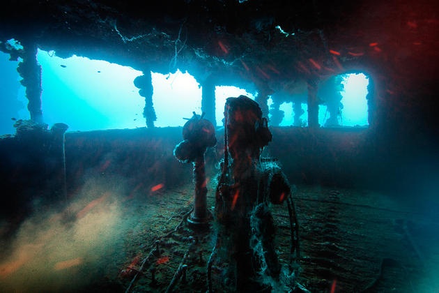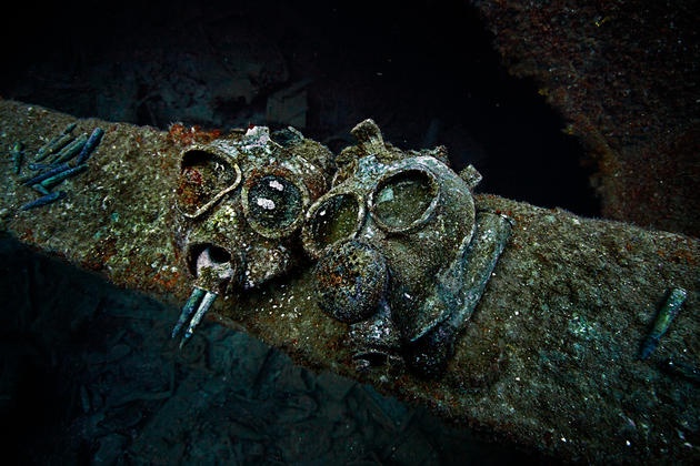Mặt nạ dưỡng khí và những viên đạn nằm la liệt trên một con tàu đắm. Thời gian biến những vũ khí chết chóc nhất trở nên vô hại. |