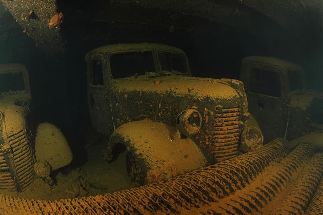 Những chiếc xe tải quân sự chìm cùng tàu vận tải Hoki Maru trong thế chiến II. |