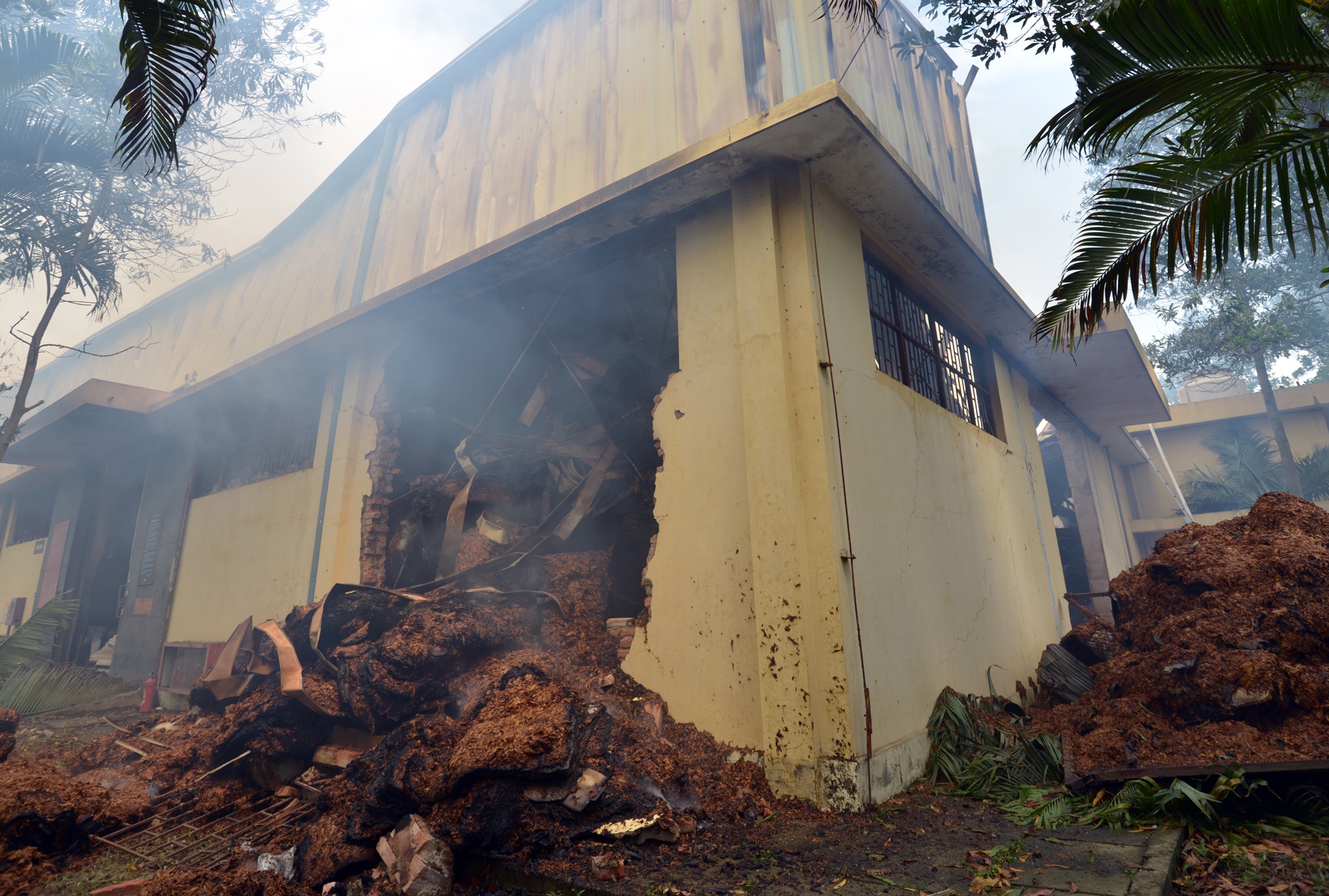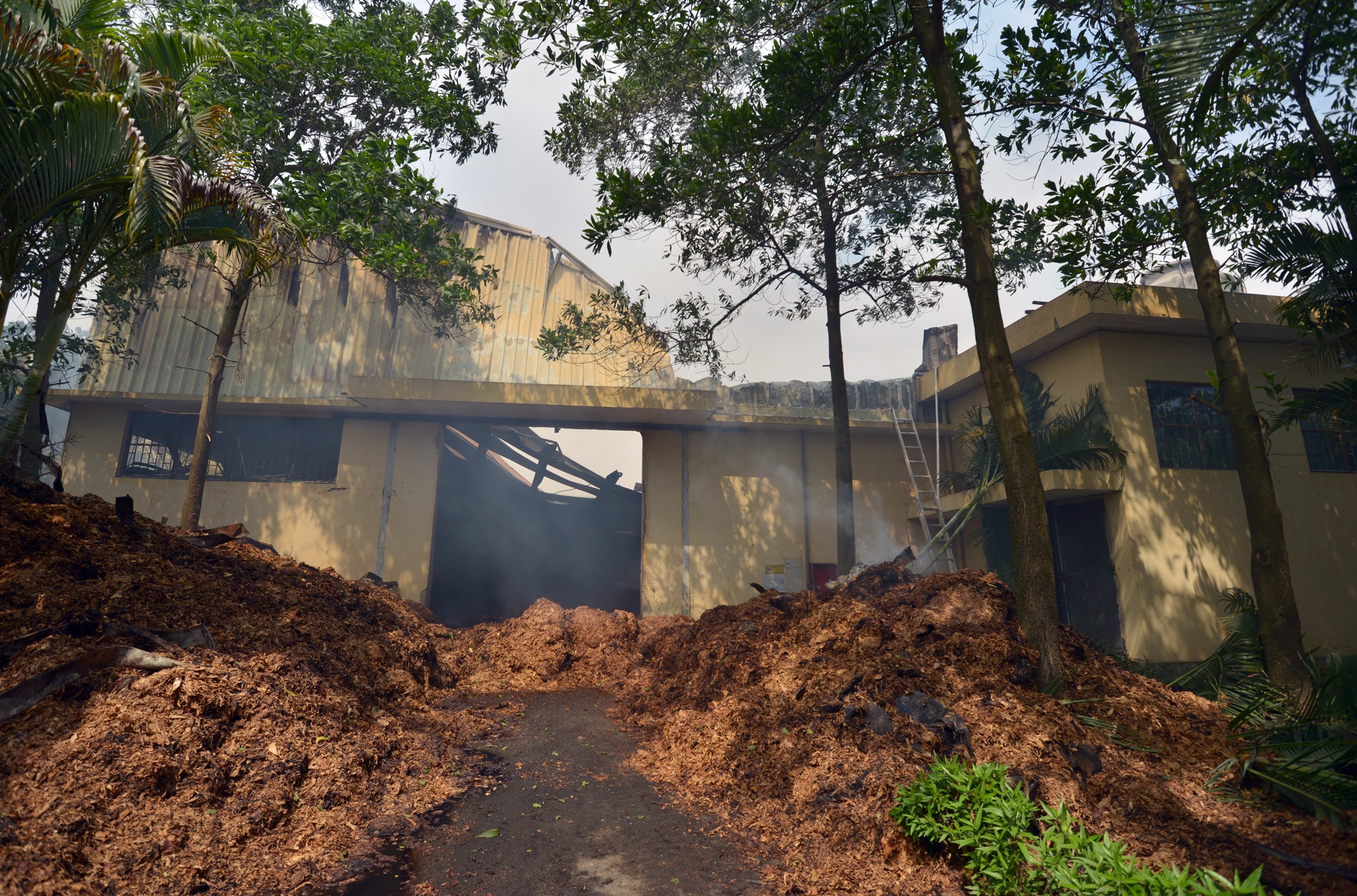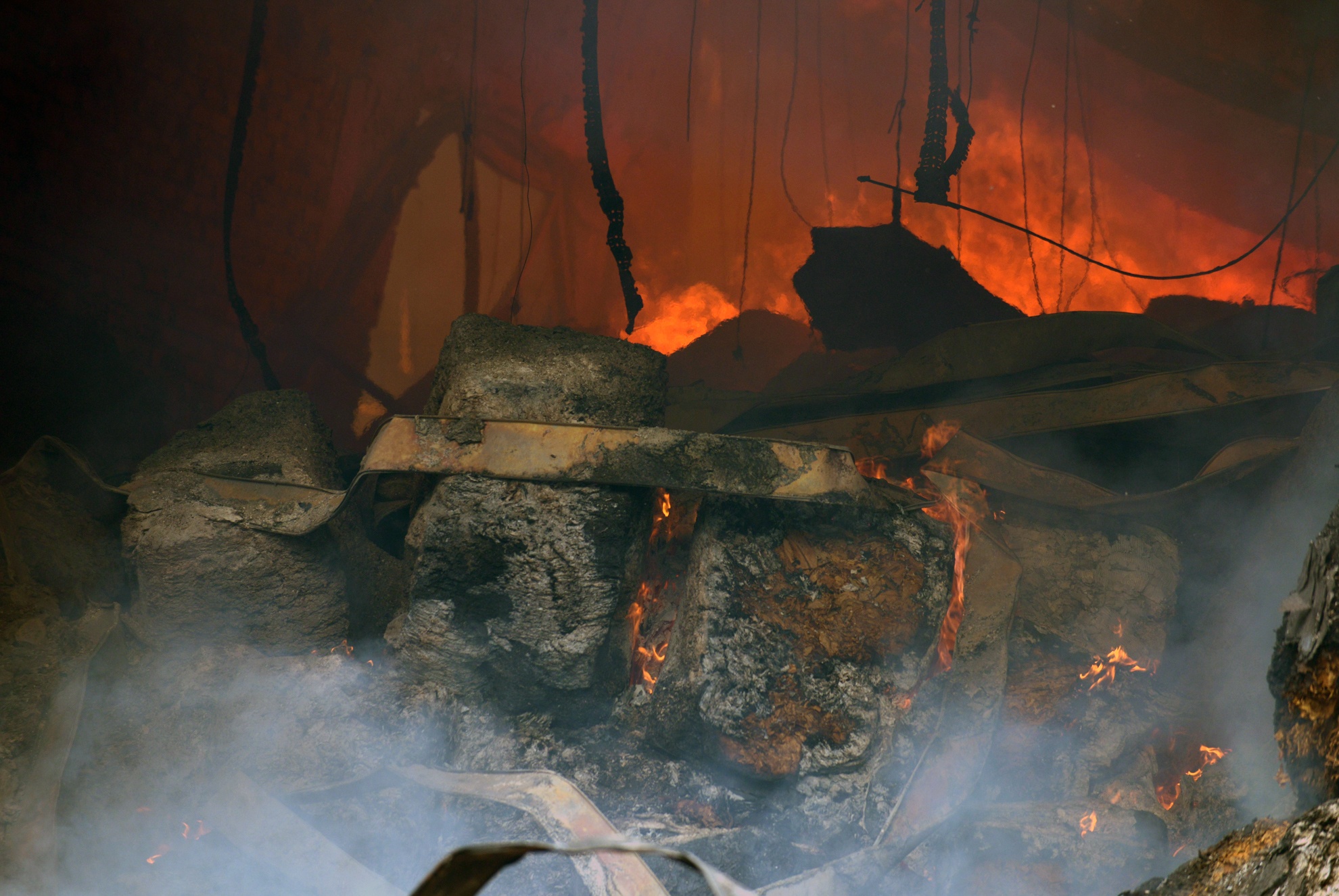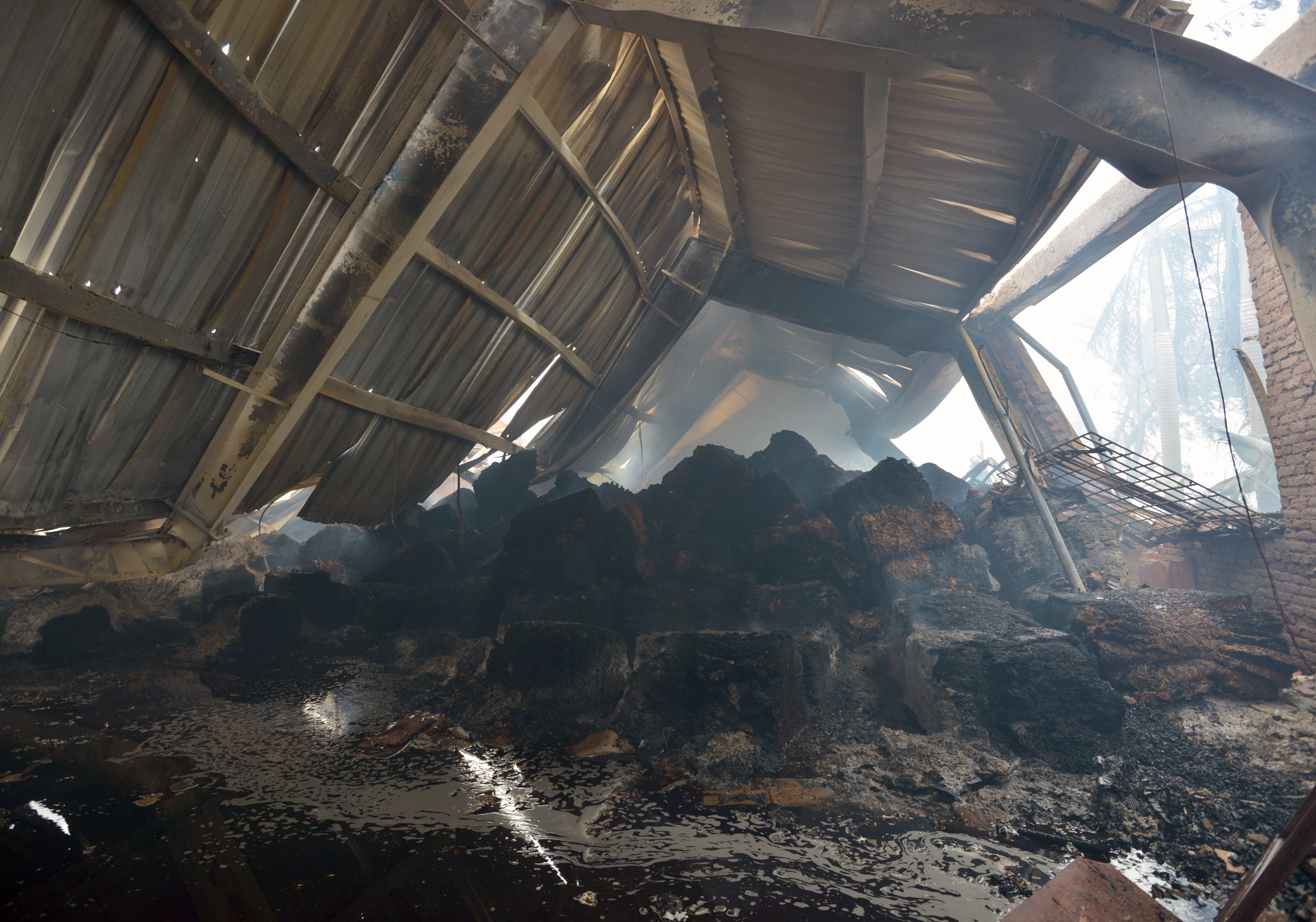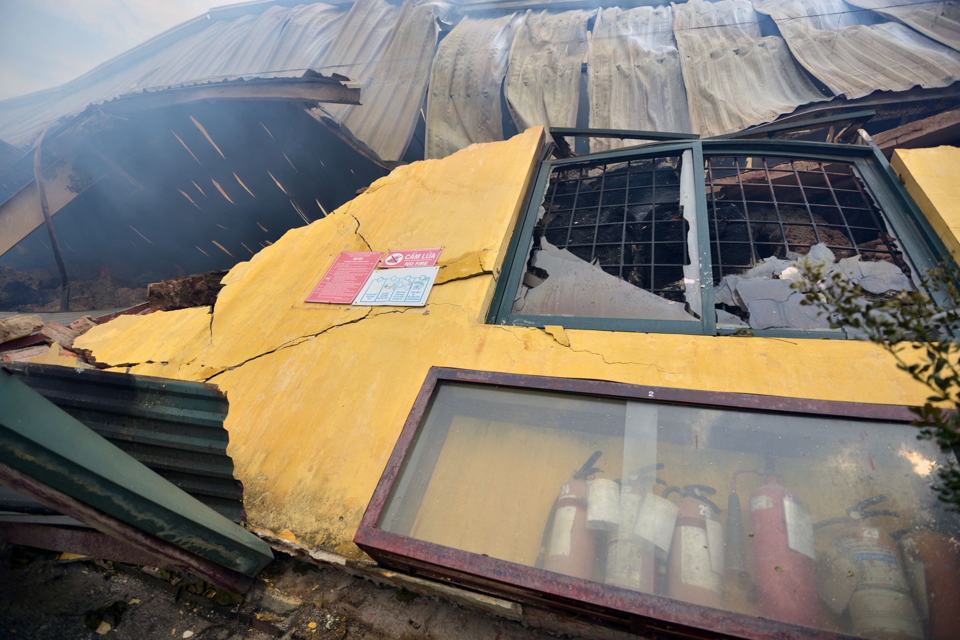 Bên trong một phân xưởng đã cơ bản được dập lửa ngổn ngang tàn tro. Mái tôn bị lửa lớn thiêu rụi, tường phá hỏng.