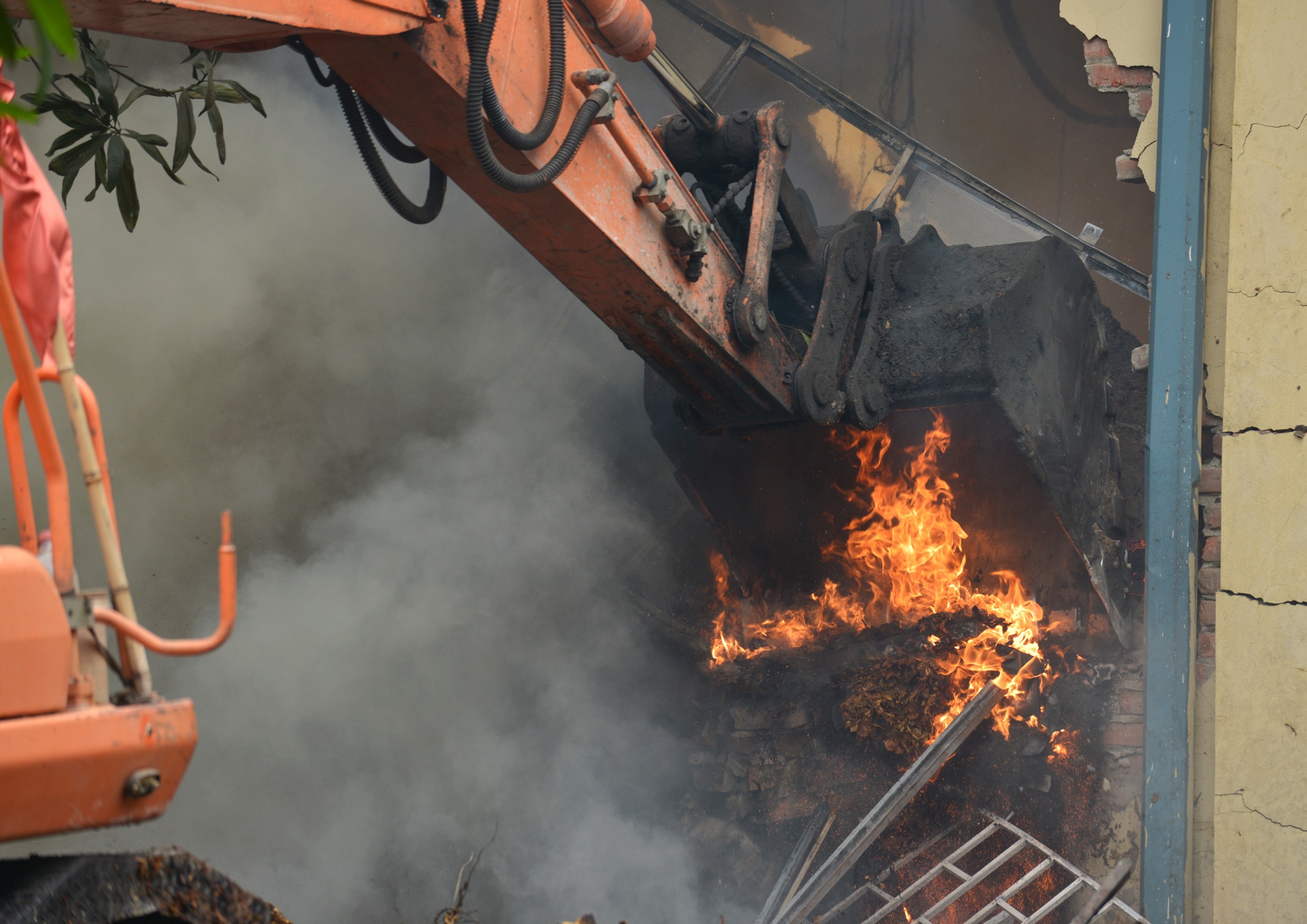 Lá thuốc cháy và chưa cháy chất thành đống lẫn lộn.