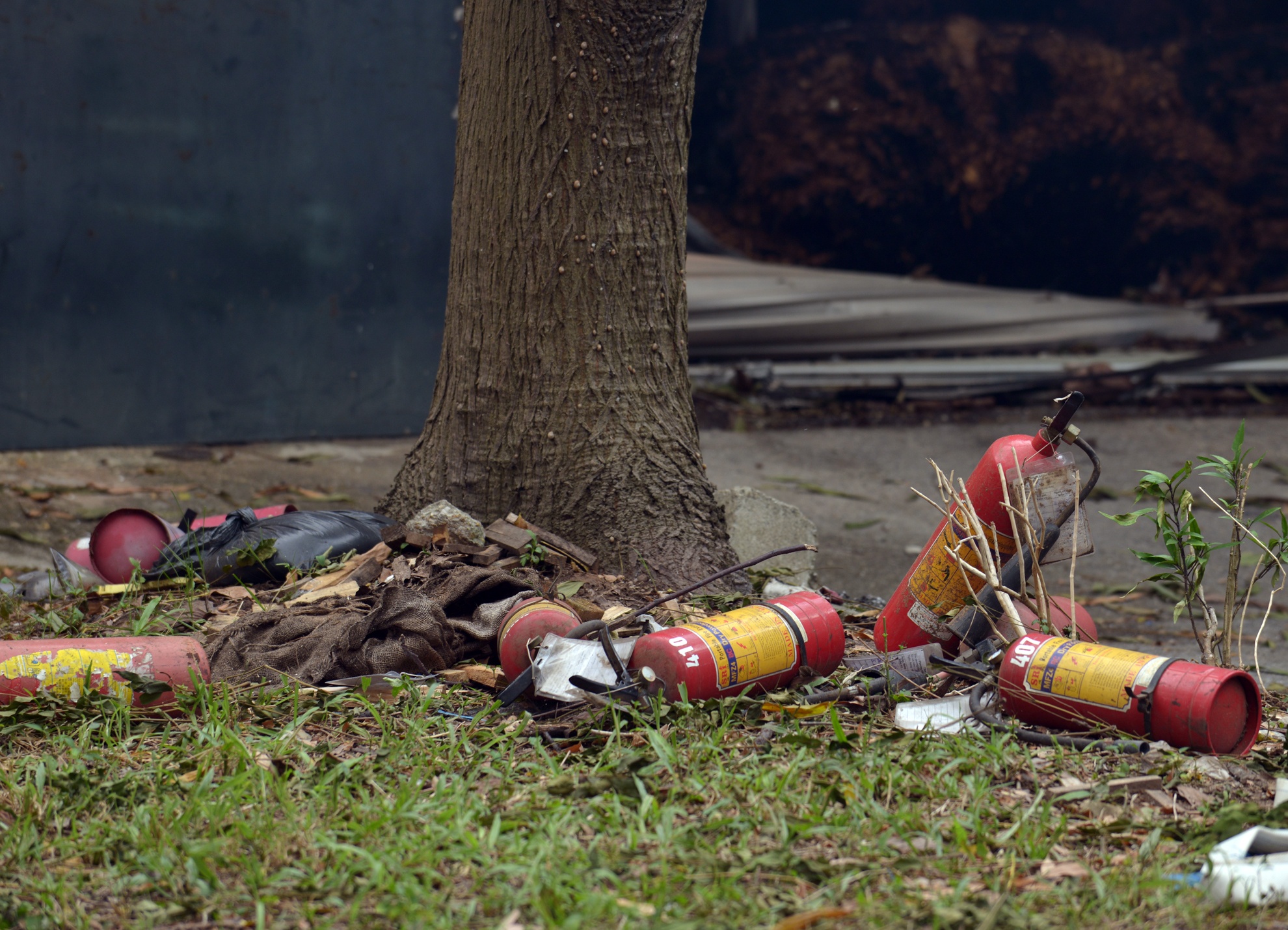 | Hàng chục bình cứu hỏa mini chỏng chơ quanh nhà kho. |