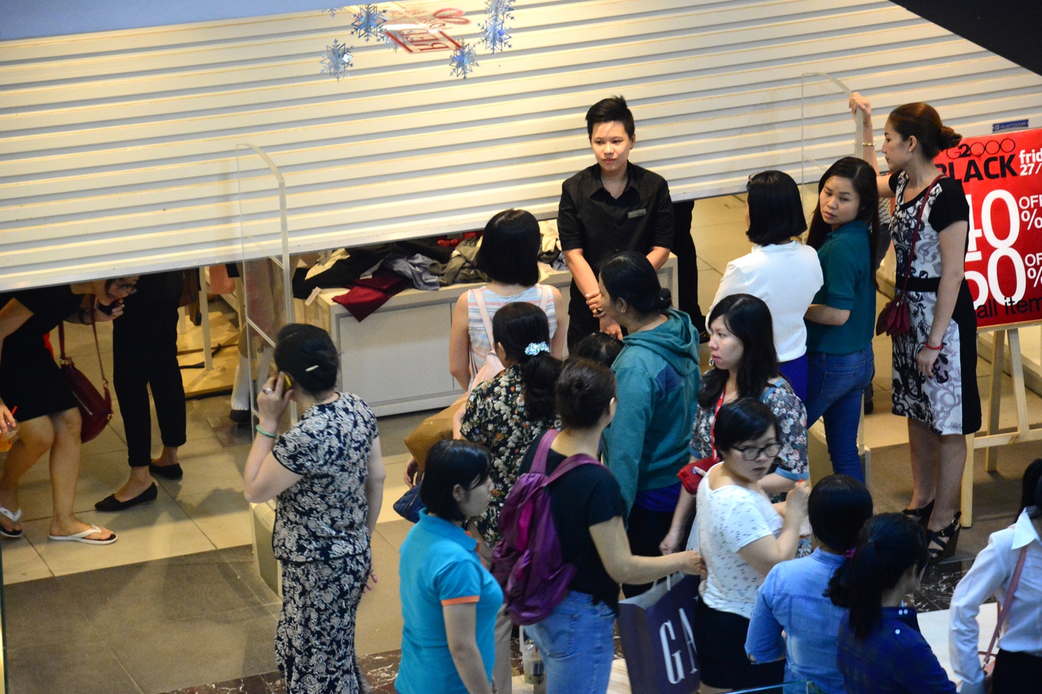 Trong ngày Thứ sáu đen, nhiều thương hiệu lớn tại TP HCM giảm giá lên đến 50-90%. Không ít khách phải chui cửa cuốn, xếp hàng dài hết cả con hẻm để chờ mua đồ.