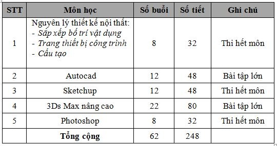 Chương trình học: Ngoài cung cấp cho học viên các kiến thức về bố trí vật dụng, trang thiết bị công trình, thiết kế chiếu sáng, màu sắc trong từng không gian sống theo các phong cách khác nhau, chương trình còn giúp cho học viên thể hiện bản vẽ khai triển kỹ thuật trên AutoCad, dùng Sketchup để dựng mô hình nội thất và sử dụng 3DsMax để thiết kế và áp vật liệu, ánh sáng cho các không gian sống một cách sinh động trực quan với dự án khi thực hiện nhất.