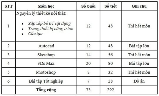 Khóa học tập trung phát triển các kỹ năng phần mềm đồ họa phục vụ công tác khai triển thiết kế nội thất. Học viên sẽ được hướng dẫn thực hành các thao tác trực tiếp cụ thể. Các môn học đều đi sâu vào phát triển các kỹ năng mô phỏng các ý tưởng thiết kế bằng không gian 3 chiều, phát huy giá trị công trình, giá trị không gian sống.