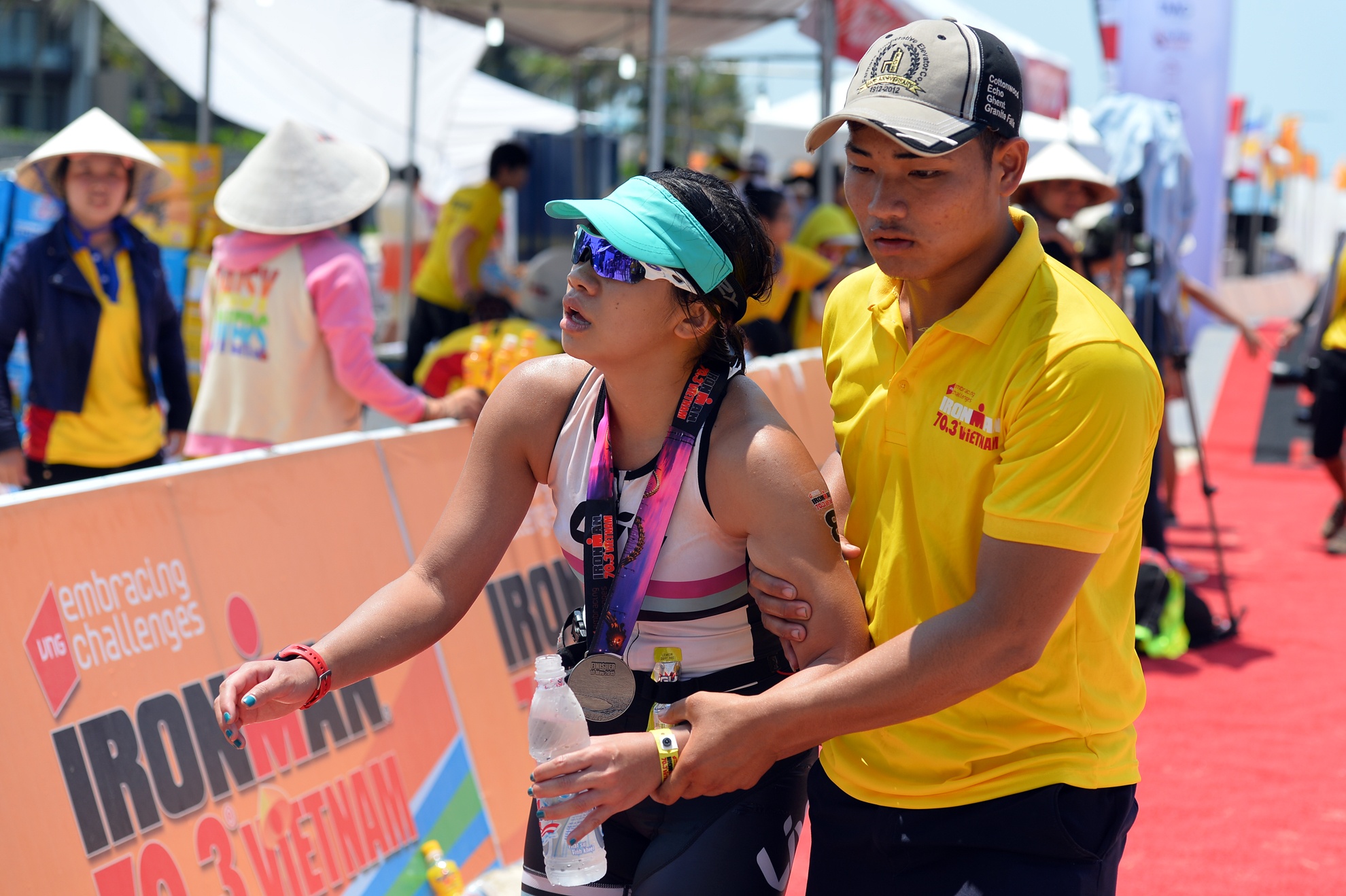 Với ba nội dung hỗn hợp gồm bơi (1,9 km), đạp xe (90 km) và chạy bộ (21,1 km), nhiều VĐV tham gia đường đua khắc nghiệt nhất - Ironman 70.3 đã bị ngất và ngã khi chạm đích.