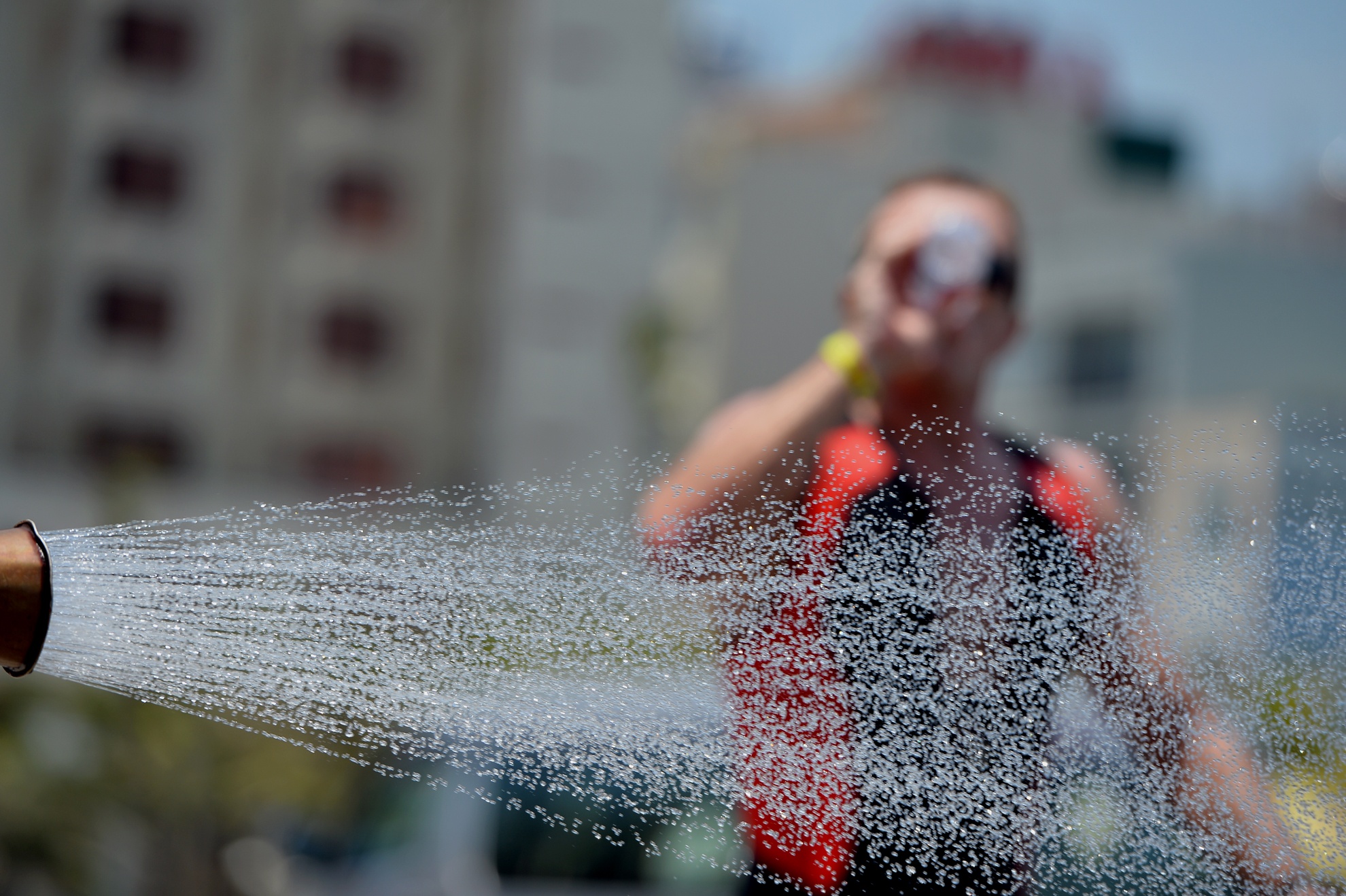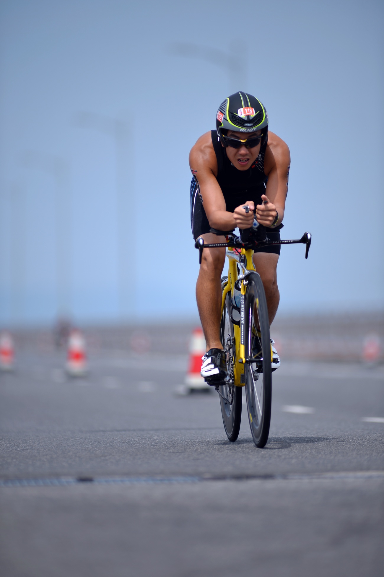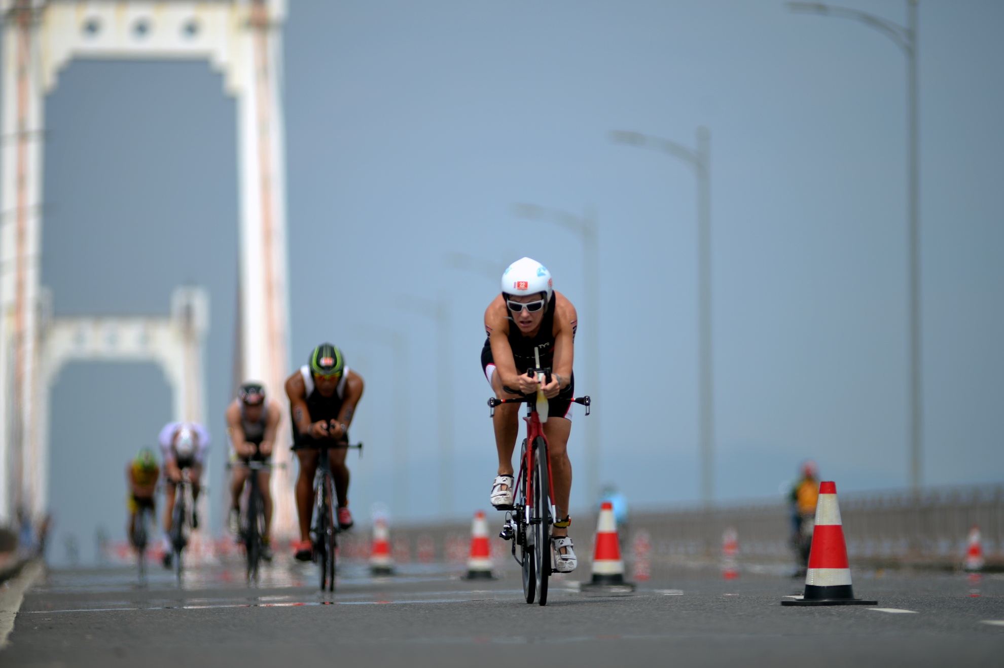 Sau khi kết thúc môn bơi, các thí sinh lên xe đạp thi ngay nội dung thứ hai mà không được nghỉ. Nhiệt độ buổi trưa ở Đà Nẵng có lúc lên đến 36 độ C. Ảnh: Tuấn Mark.