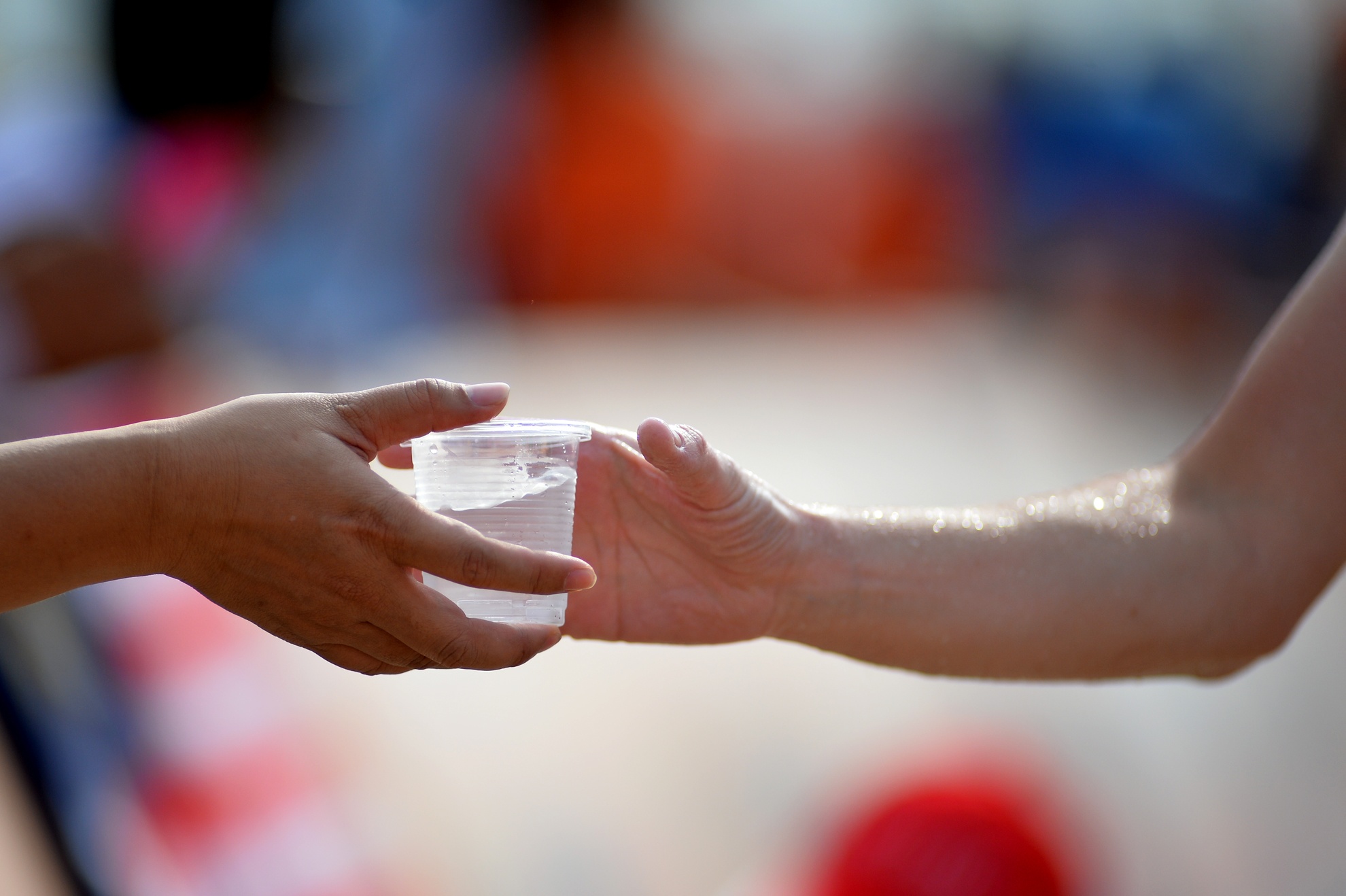 Nhiều người vừa chạy chậm vừa với tay lấy nước uống liên tục vì quá khát. Ảnh: Hoàng Hà.