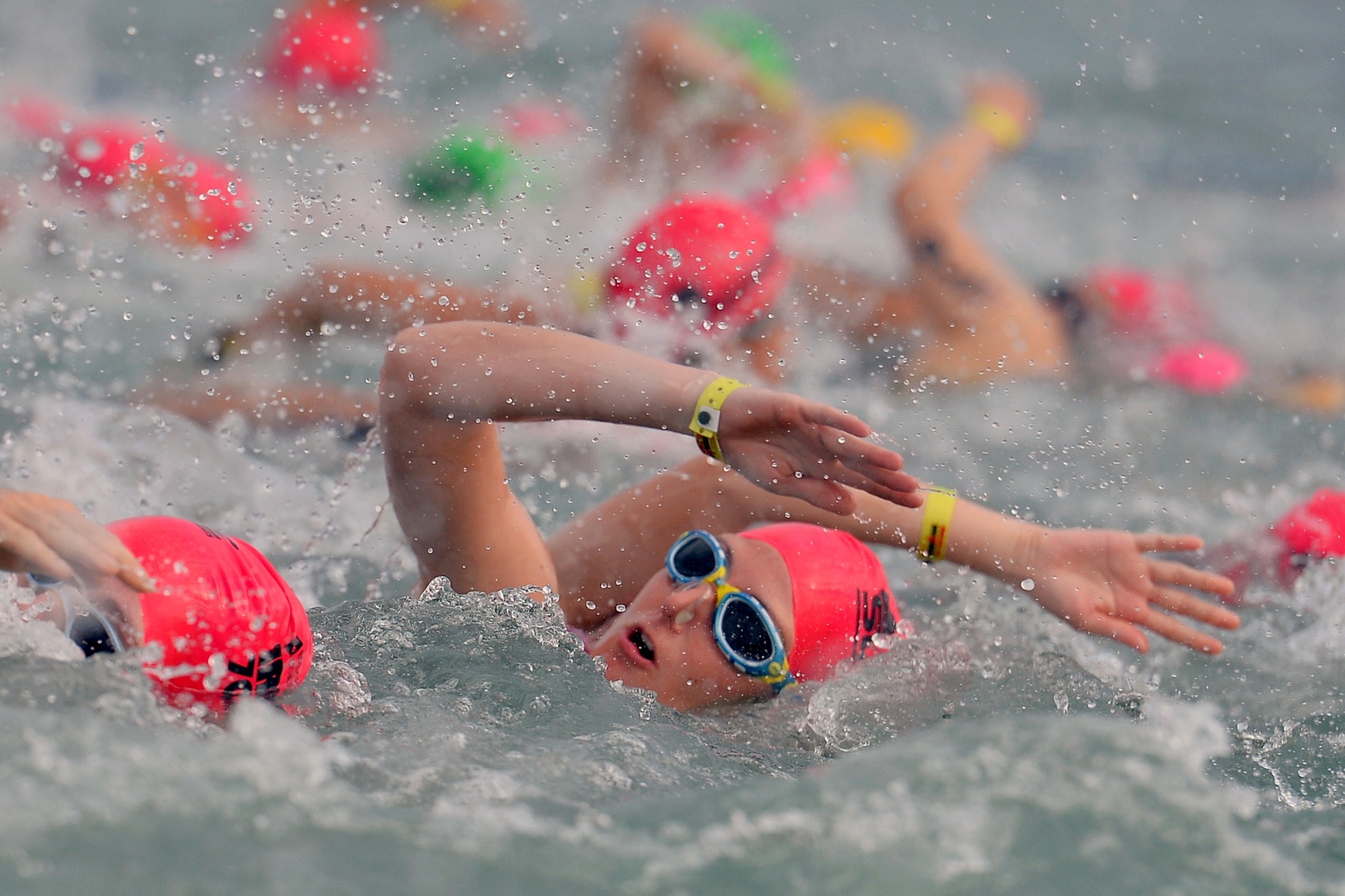 Hơn nghìn VĐV bắt đầu nhập cuộc từ 7h sáng, chia làm nhiều nhóm, lần lượt bơi ra biển theo mốc đã cắm, chiều dài cả lượt ra và vào là 1,9 km. Ảnh: Tuấn Mark.