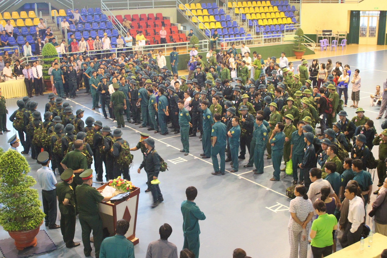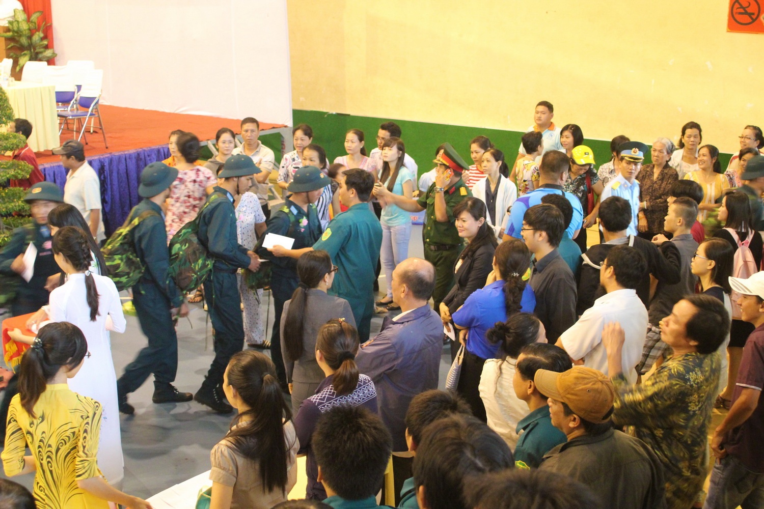 | Đông đảo người thân và bạn bè chào tạm biệt các thanh niên nhập ngũ tại Nhà thi đấu Rạch Miễu, P.2, Q.Phú Nhuận. |
