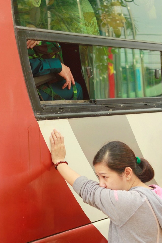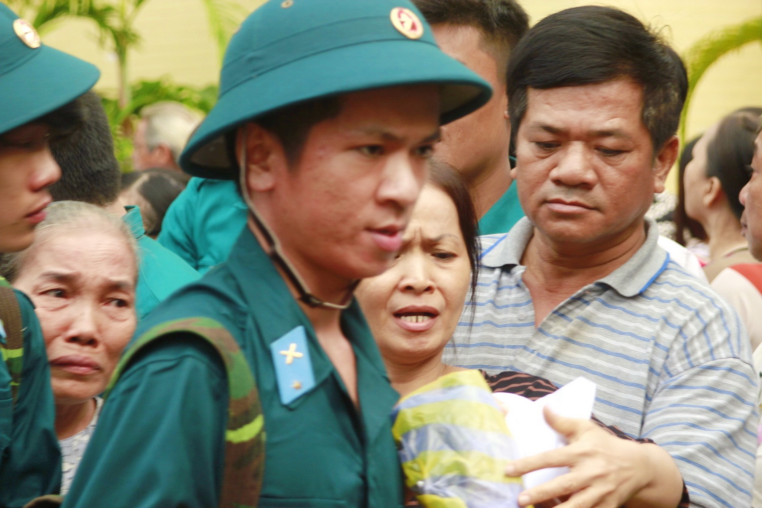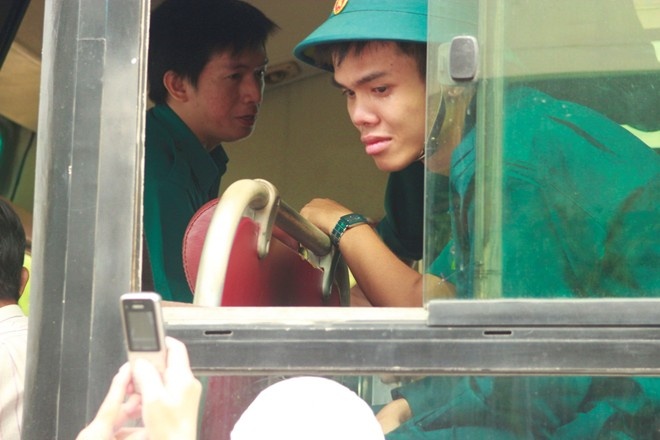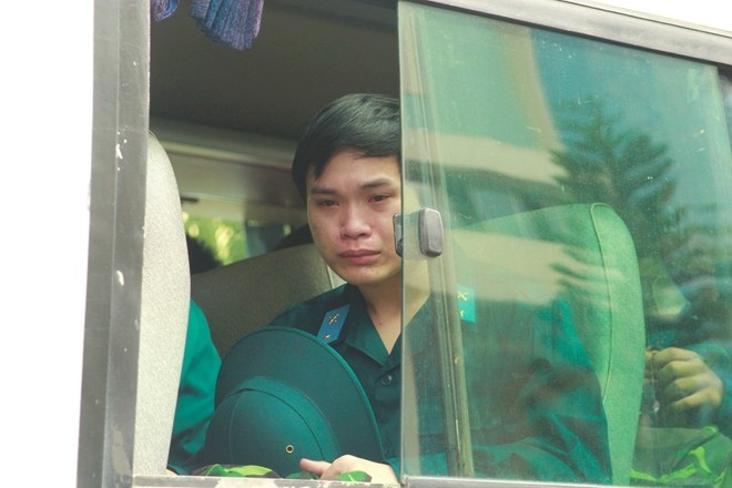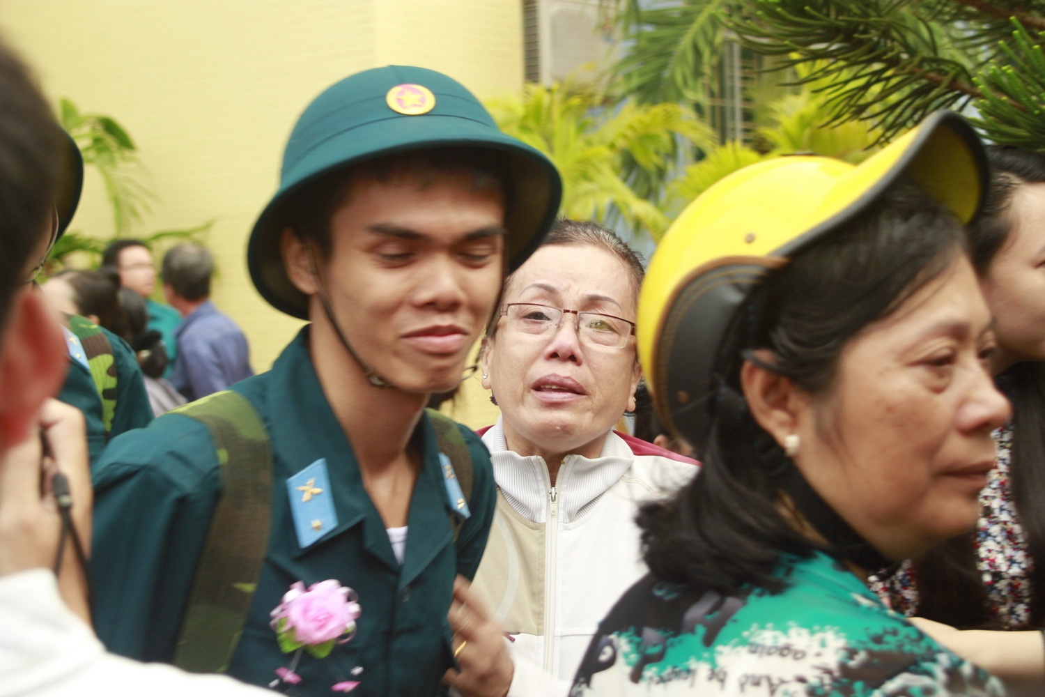 | Nhiều tân binh trẻ lần đầu tiên xa nhà không kiềm được cảm xúc khi chia tay người thân. |