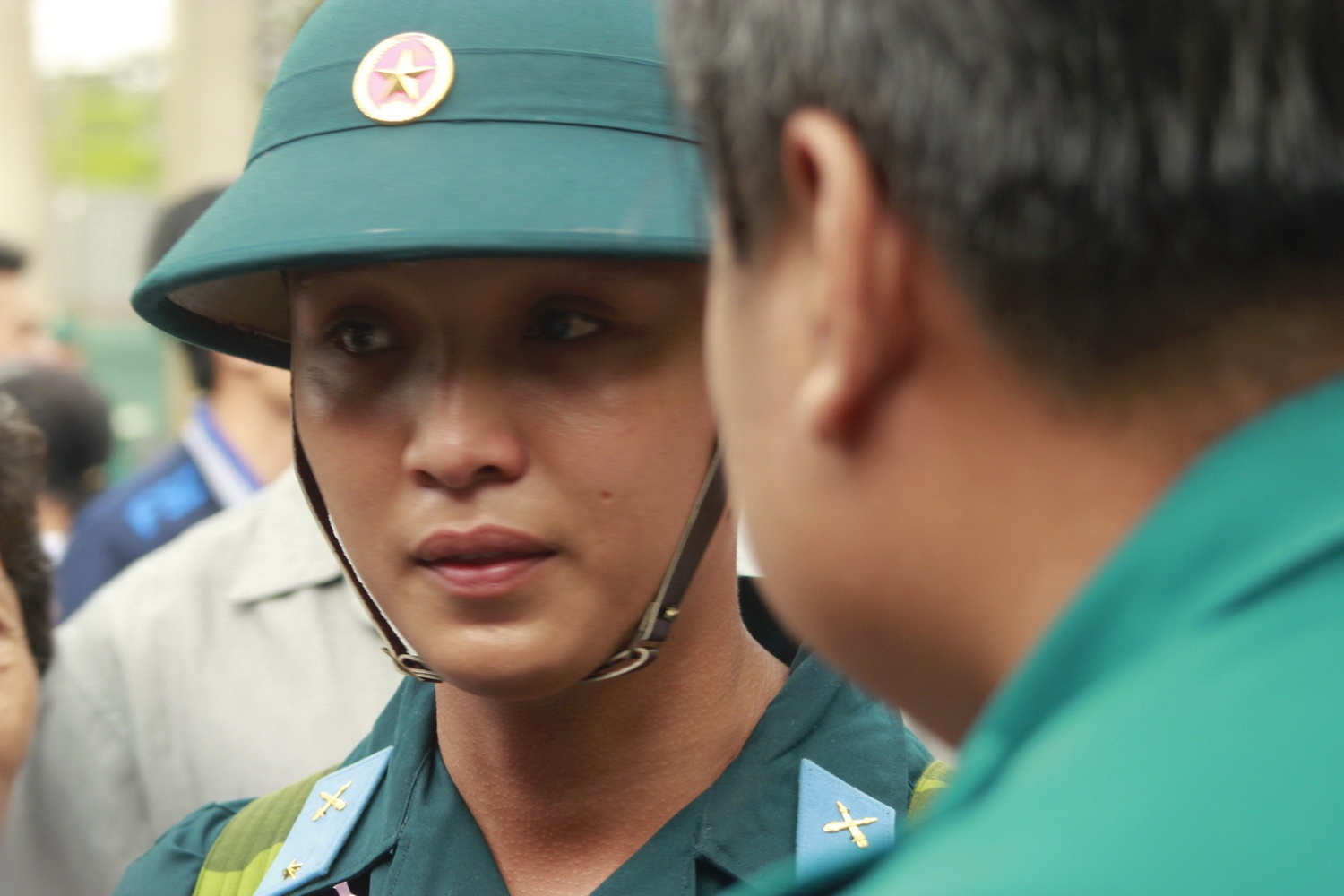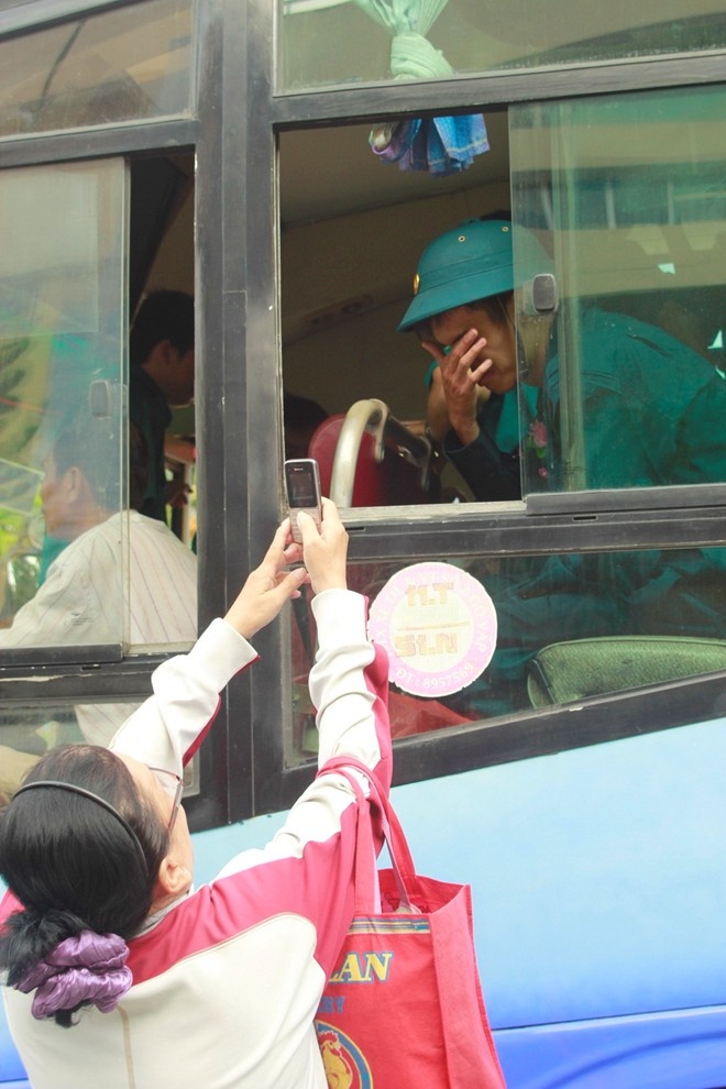 | Người mẹ chụp ảnh lưu lại kỷ niệm khi con trai lên đường tòng quân. |
