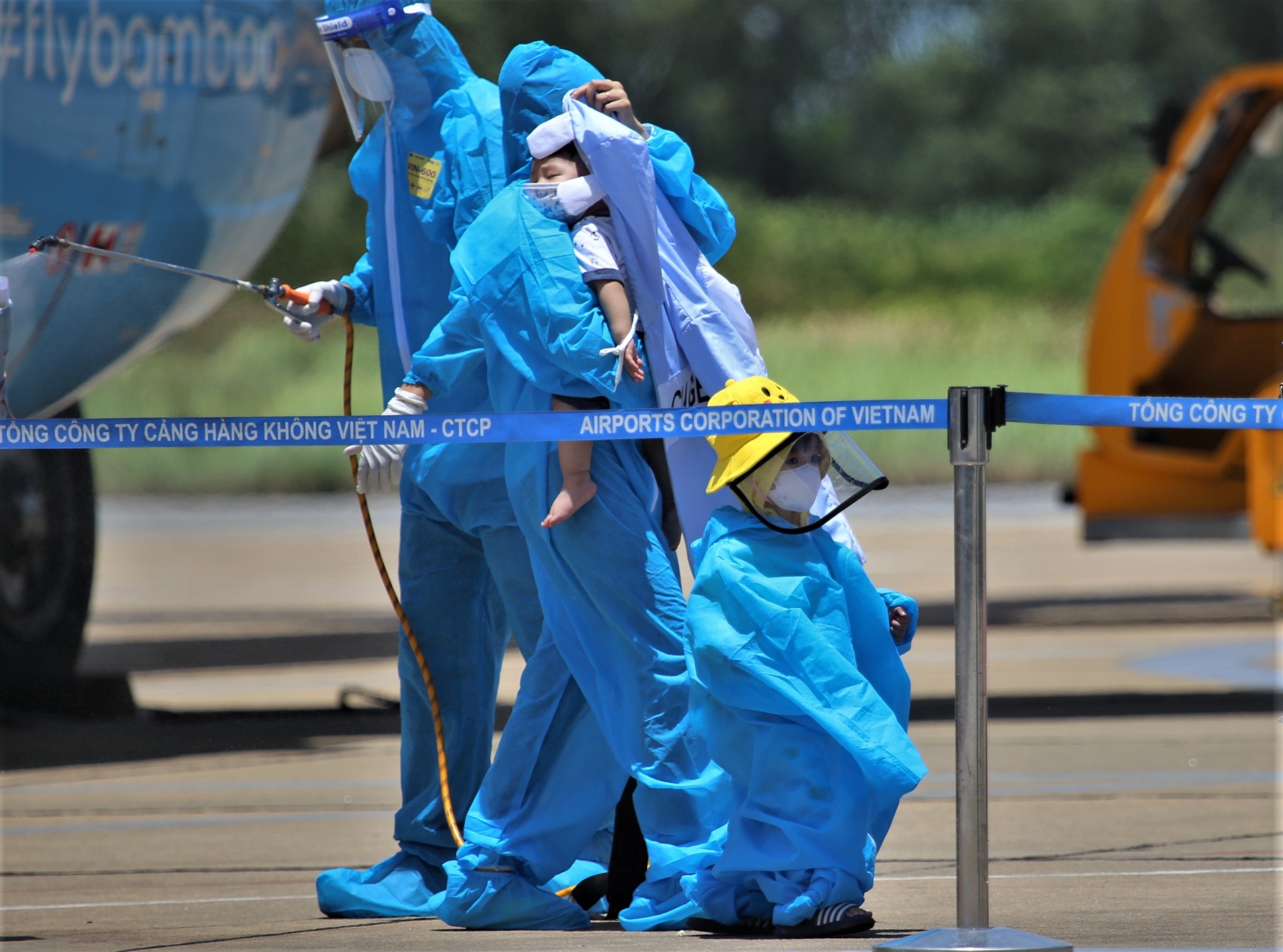 Chị Hiền (trú huyện Kỳ Anh) nói rằng gần một tháng qua, chị rất lo lắng vì dịch Covid-19 bùng phát mạnh ở TP.HCM, Bình Dương. Khi nghe tin chính quyền phối hợp với Hội Đồng hương Hà Tĩnh bố trí 5 chuyến bay đưa công dân trở về, chị đã đăng ký cho 3 mẹ con và bà ngoại. Trưa 6/8, chuyến bay đầu tiên chở 190 công dân Hà Tĩnh sinh sống, làm việc và học tập ở TP.HCM hạ cánh xuống sân bay Vinh, tỉnh Nghệ An. Ảnh: Phạm Trường.