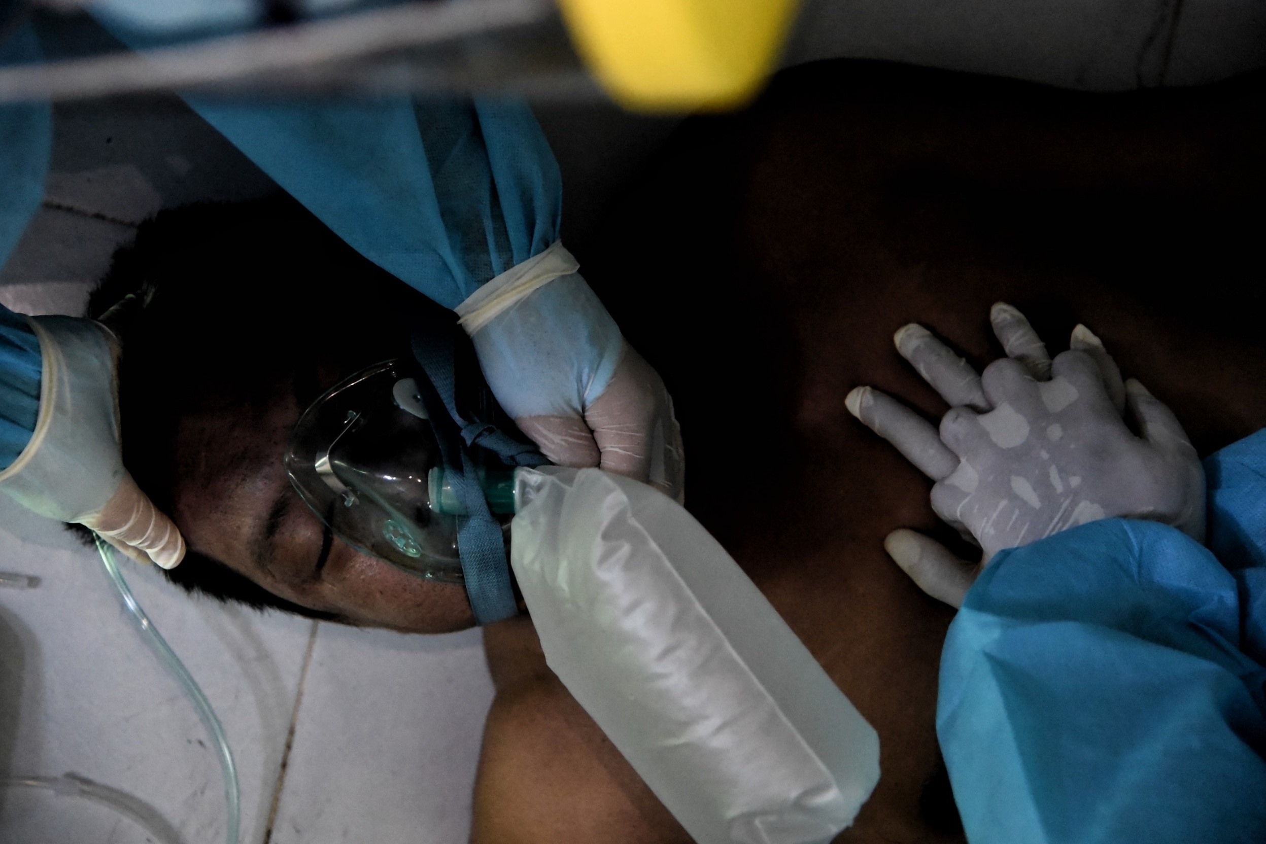 Các y bác sĩ sơ cứu cho một bệnh nhân Covid-19 bị ngưng tim tại nhà. Bác sĩ Tuyết chỉ đạo một nam đồng nghiệp ép lồng ngực để hô hấp nhân tạo cho bệnh nhân, trong khi chị gọi điện xin một chuyến xe cấp cứu chuyên dụng. Ca F0 này đã hôn mê và suy hô hấp nặng, không thể chuyển đi bằng taxi được nữa. Ảnh: Ngọc Tân.
