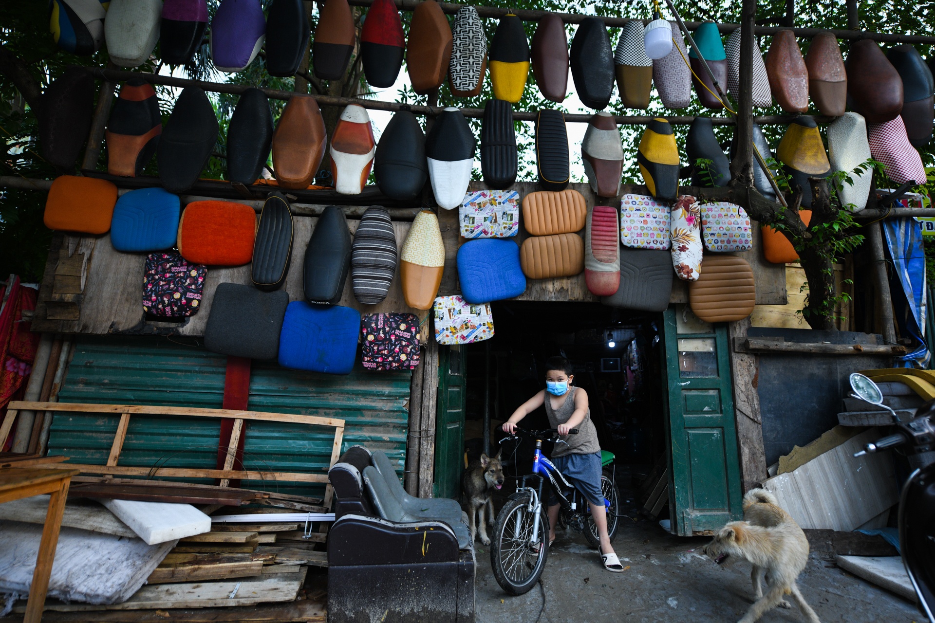 Một người đàn ông gọi điện cho người phía bên trong khu phong tỏa hẹn trước địa điểm sau đó trèo lên mặt đê, bế một em nhỏ trèo rào ra ngoài. Lúc này, lực lượng canh gác mỏng, nhiều người dân ở phường Chương Dương, quận Hoàn Kiếm, luồn dây thép gai, trèo rào ra khỏi khu vực phong tỏa. Ảnh: Việt Linh.