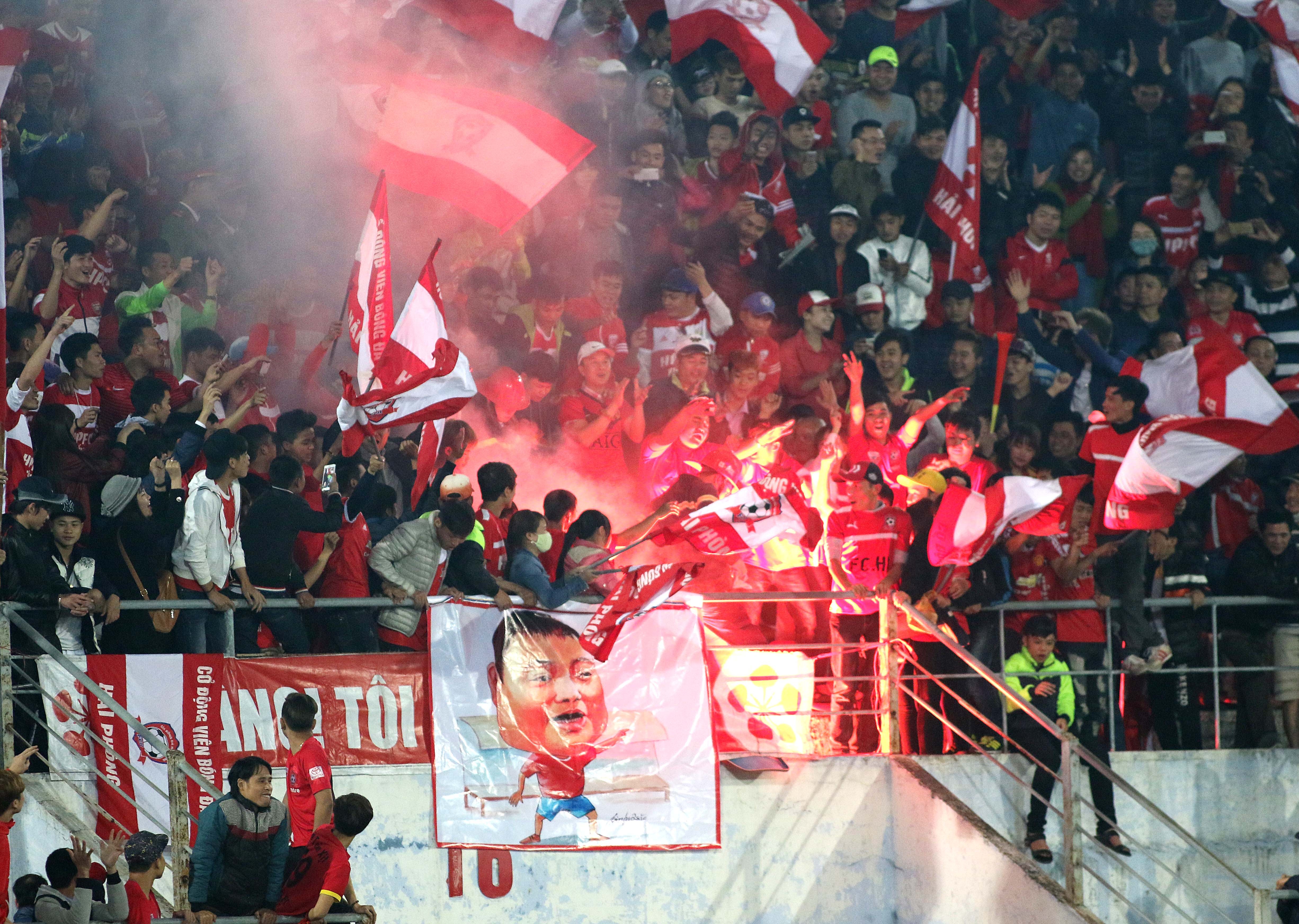 Như thường lệ, CĐV Hải Phòng đốt pháo sáng ăn mừng cùng tấm tranh vẽ HLV trưởng Trương Việt Hoàng.