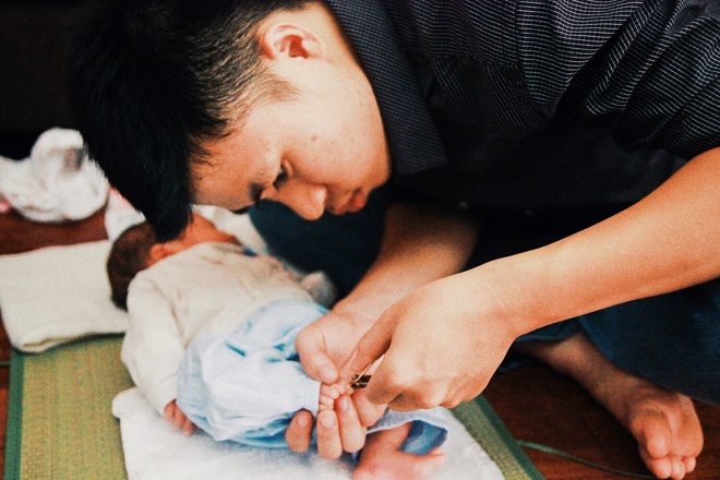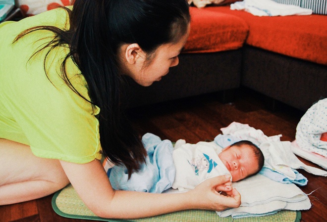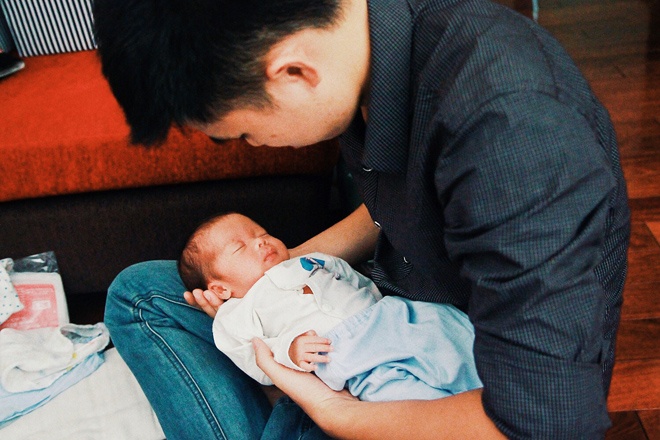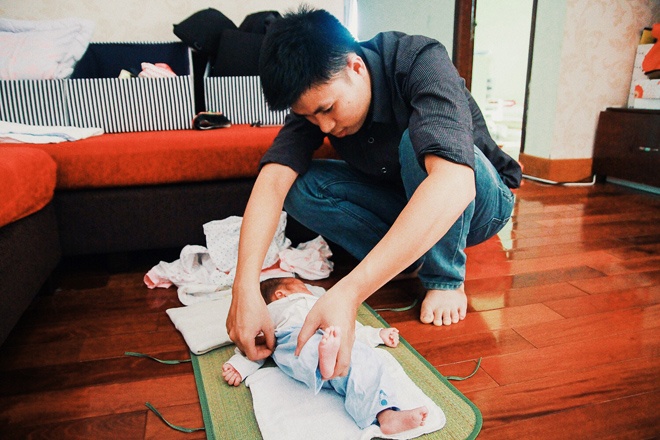 | Kể lại thời gian chăm con suốt một tháng qua, ông bố trẻ chia sẻ, anh chưa quen làm công việc của một người mẹ nên thường lên mạng tìm thông tin, học kinh nghiệm chăm con. |