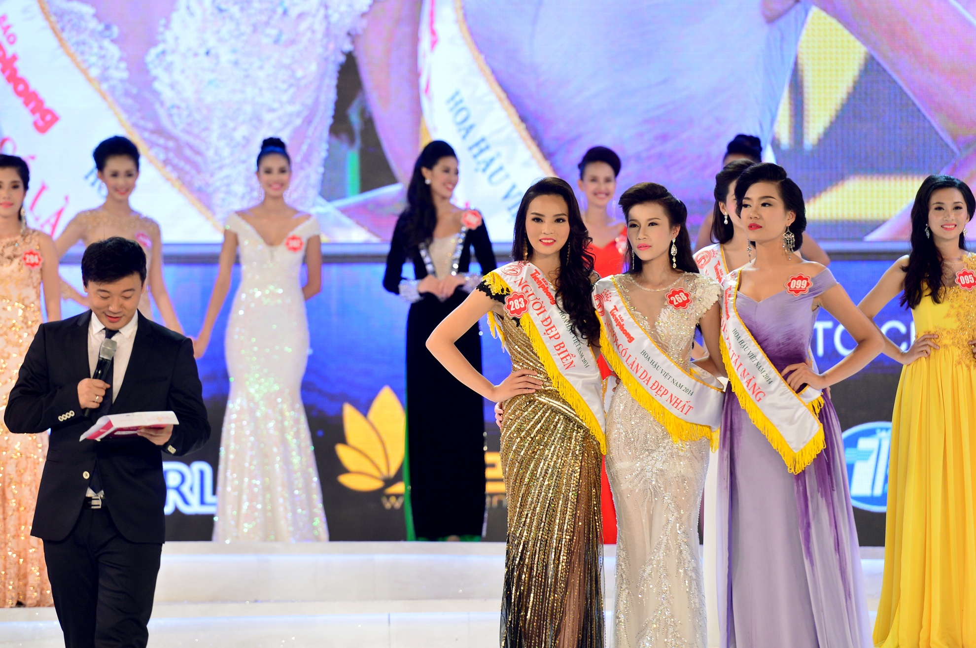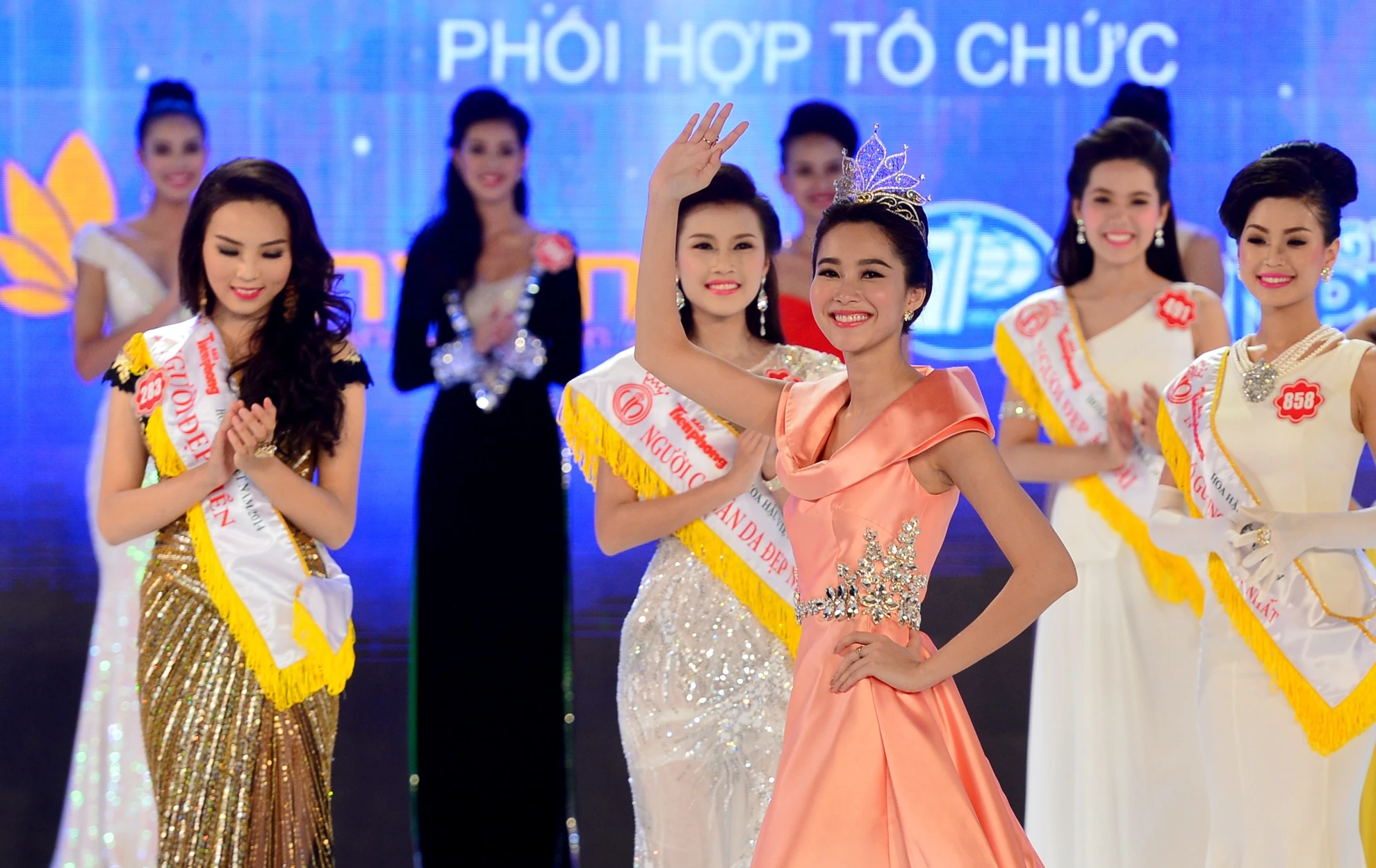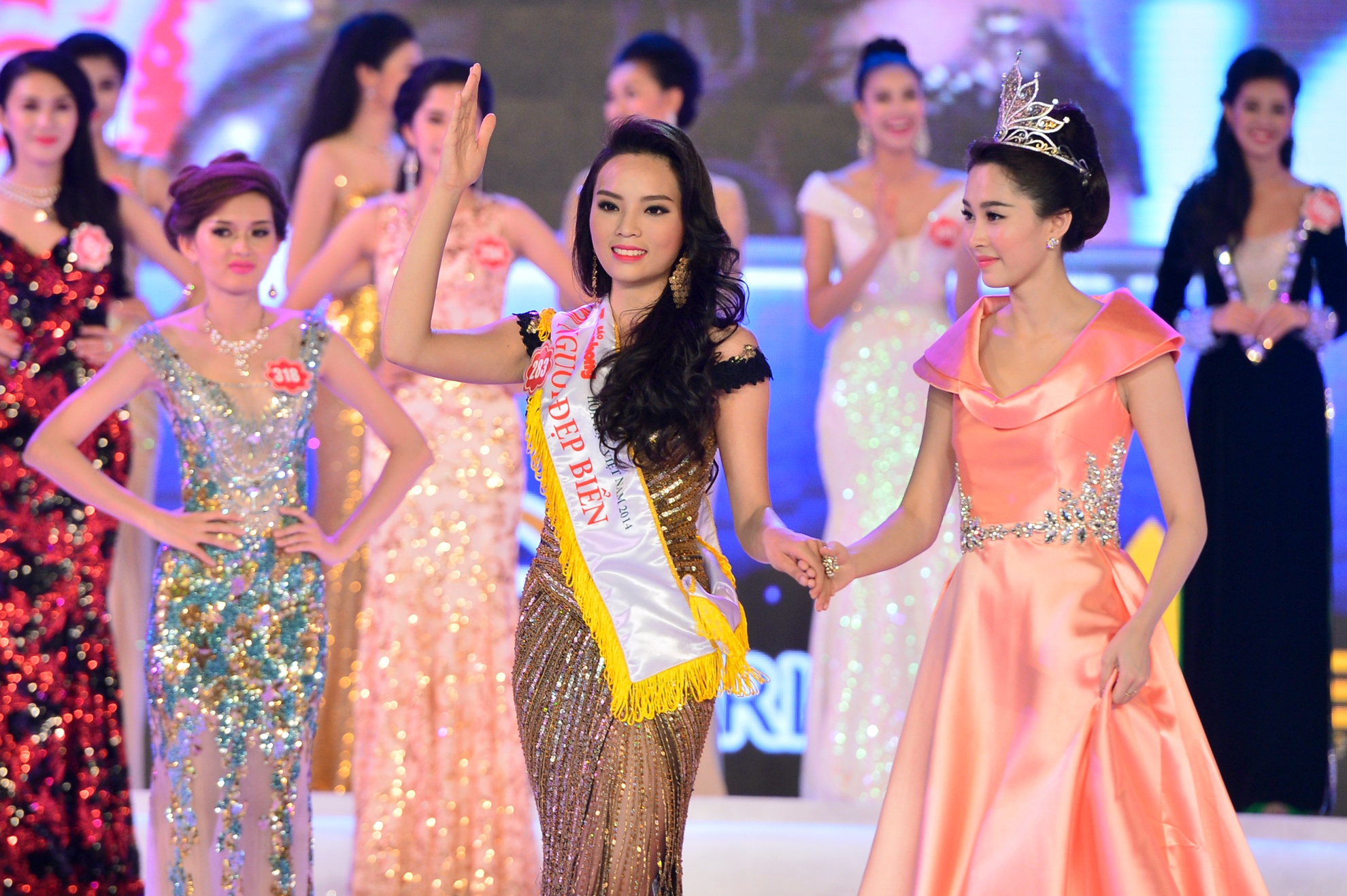 | Đêm chung kết cuộc thi Hoa hậu Việt Nam 2014 tại Vinpearl Land Phú Quốc (Kiên Giang), tại thời khắc công bố chủ nhân của chiếc vương miện trị giá 2,5 tỷ đồng, Hoa hậu Đặng Thu Thảo bắt đầu bước ra sân khấu từ cánh gà vẫy tay chào khán giả đầy rạng rỡ. |