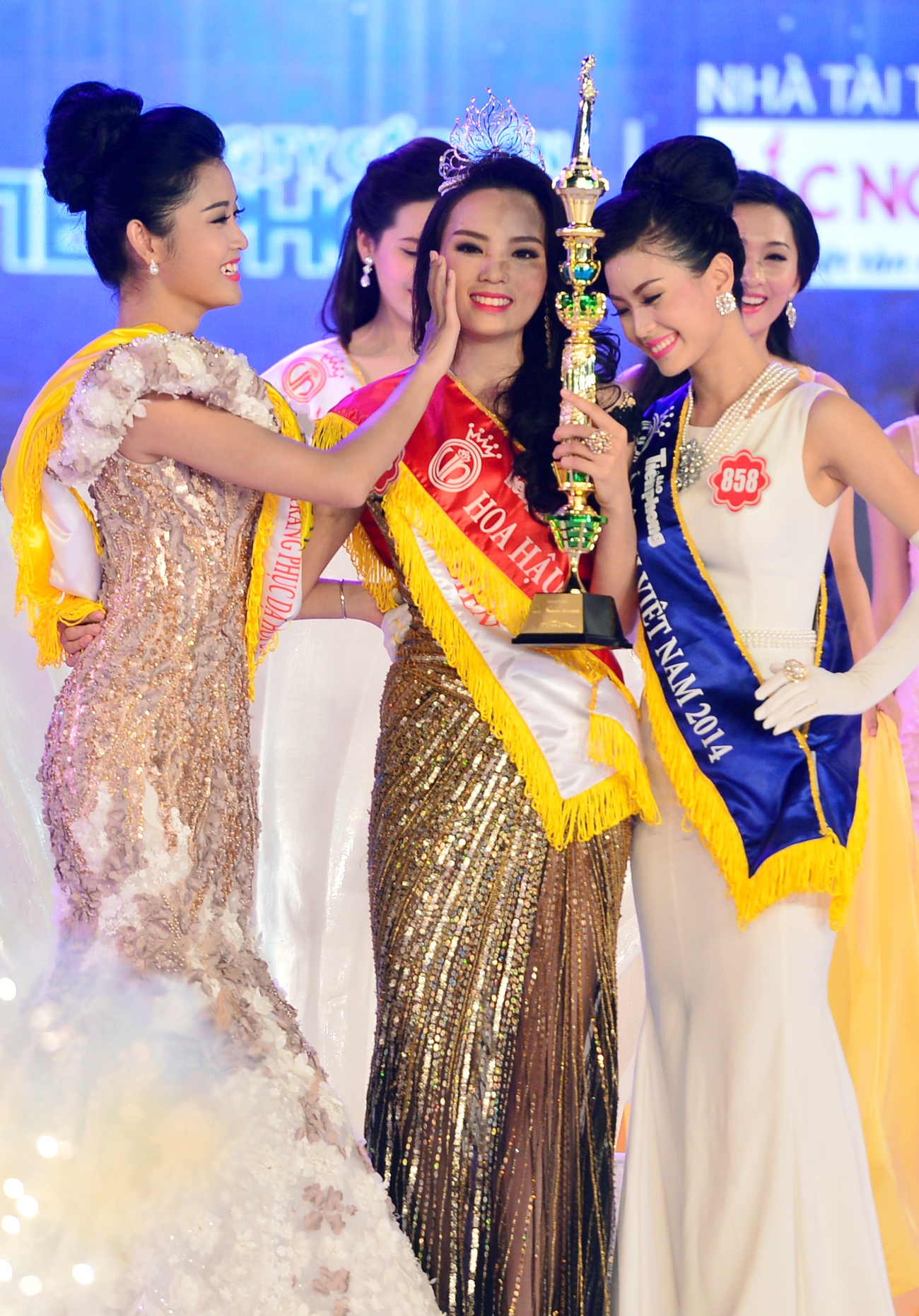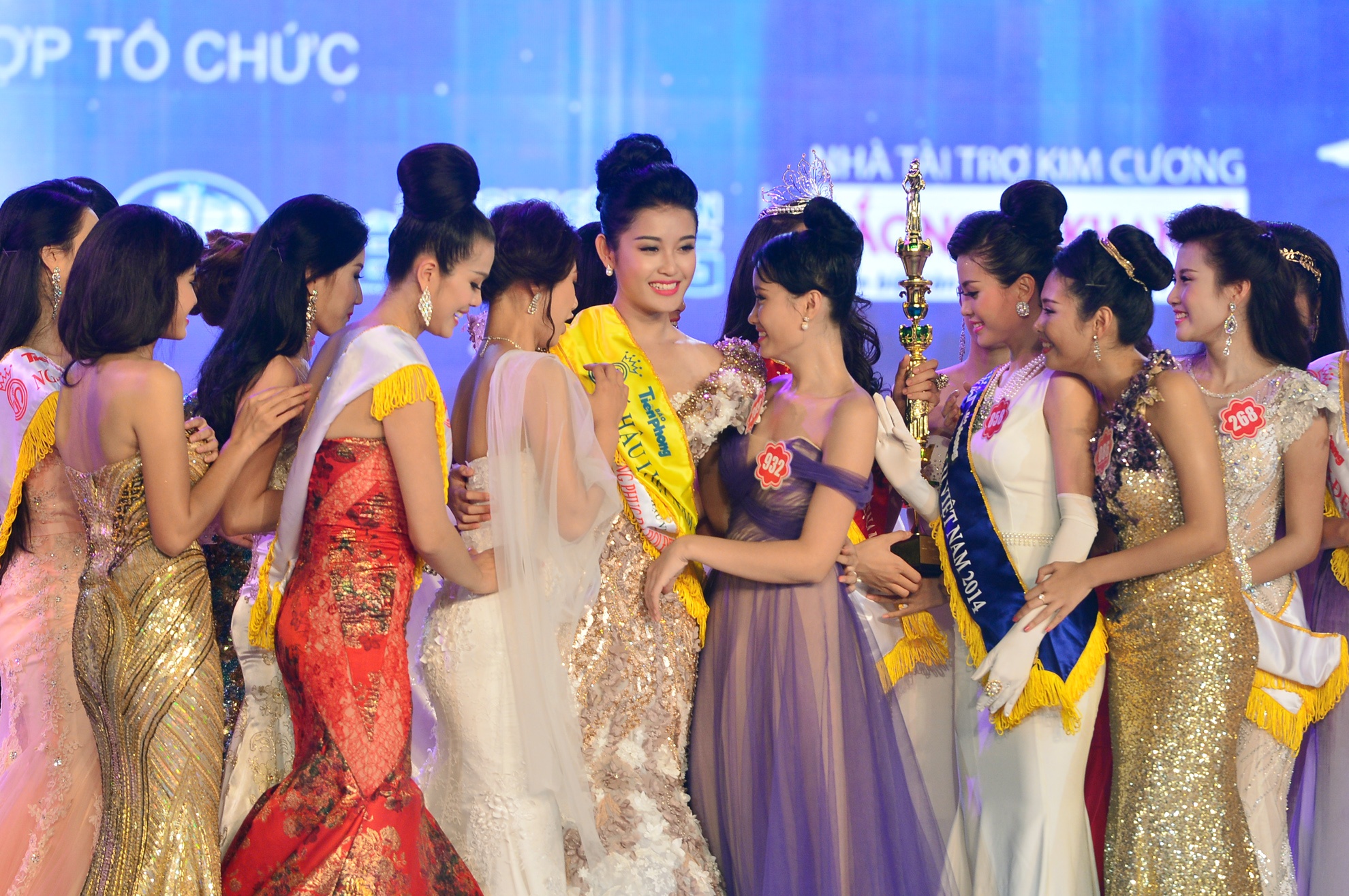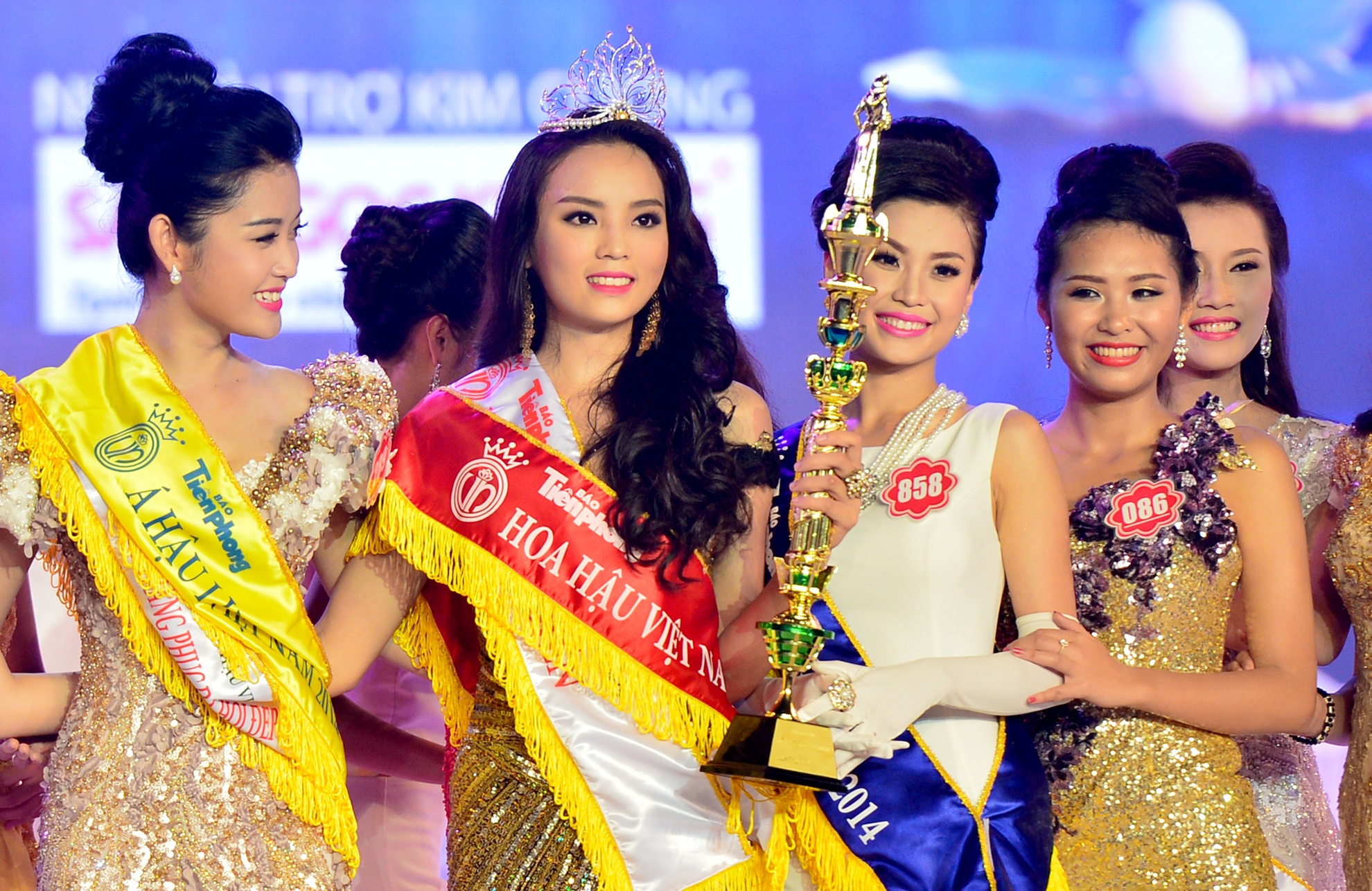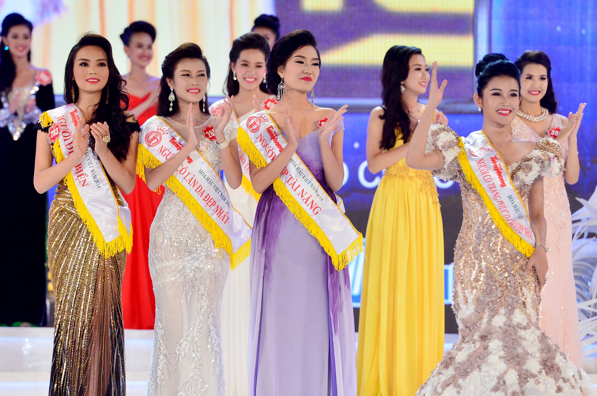 | Đêm chung kết cuộc thi Hoa hậu Việt Nam 2014 tại Vinpearl Land Phú Quốc (Kiên Giang), tại thời khắc công bố chủ nhân của chiếc vương miện trị giá 2,5 tỷ đồng, Hoa hậu Đặng Thu Thảo bắt đầu bước ra sân khấu từ cánh gà vẫy tay chào khán giả đầy rạng rỡ. |