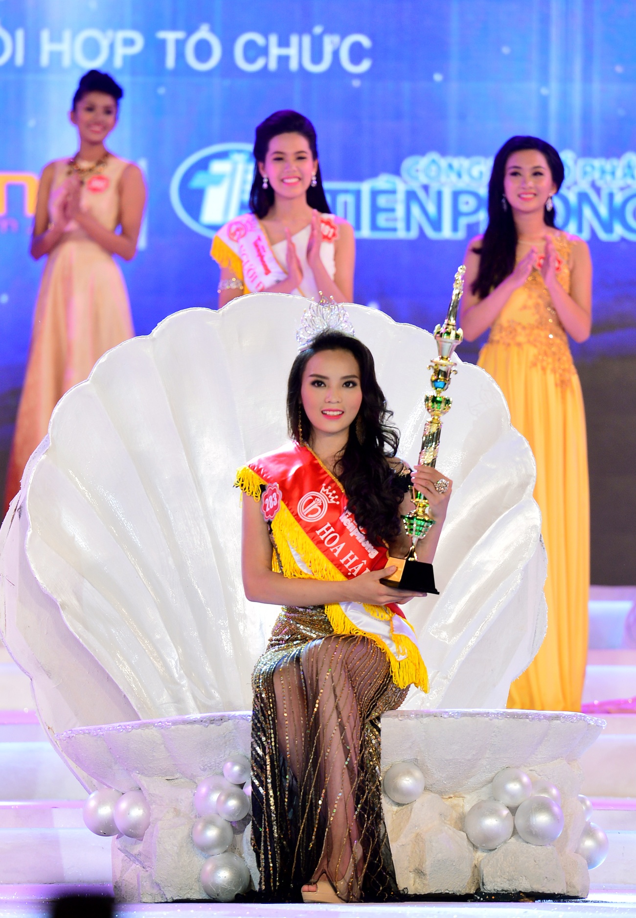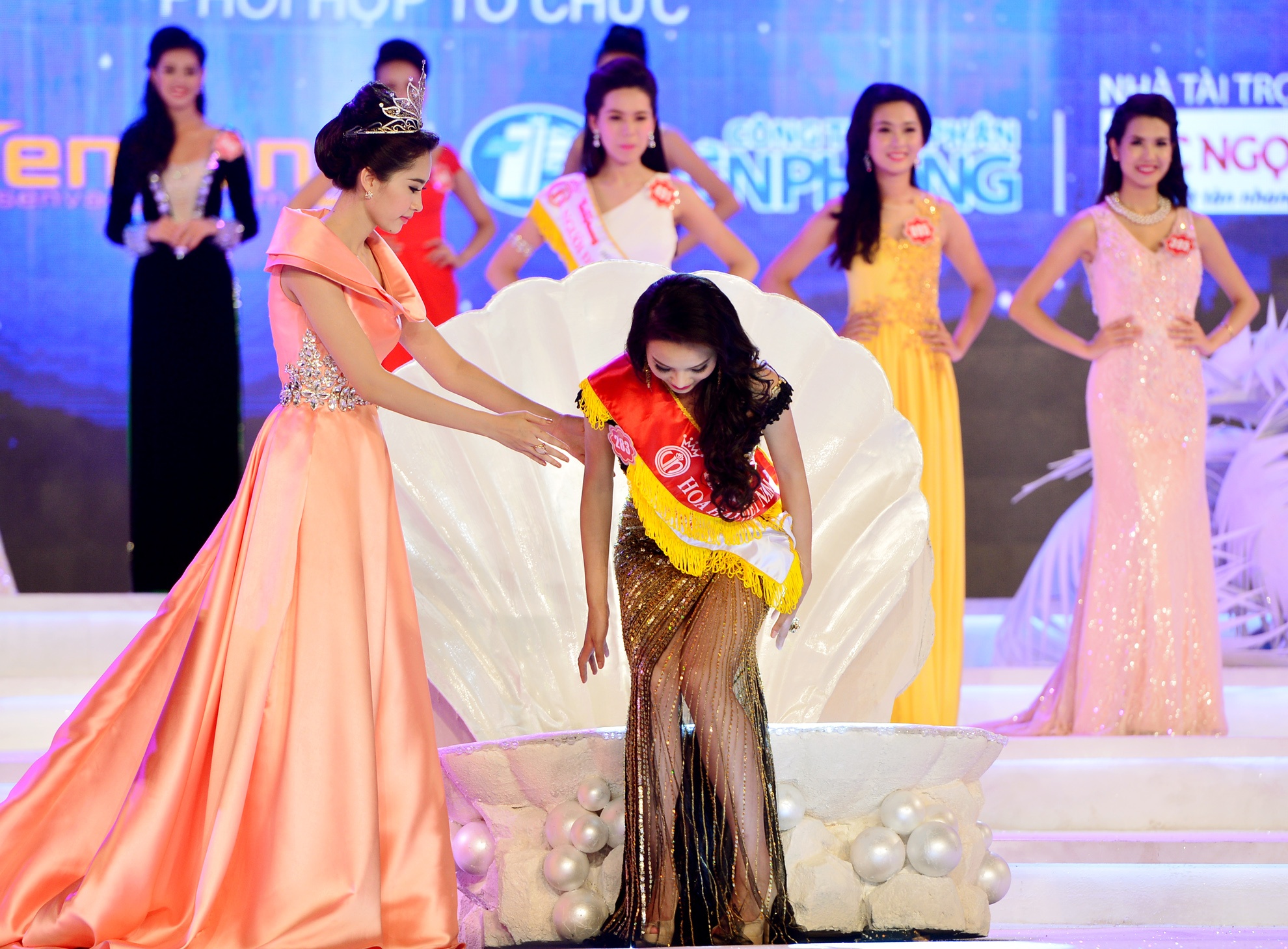 | Thu Thảo dẫn tân Hoa hậu ngồi vào bục vinh quang có mô hình vỏ sò, nét mới của cuộc thi năm nay. |