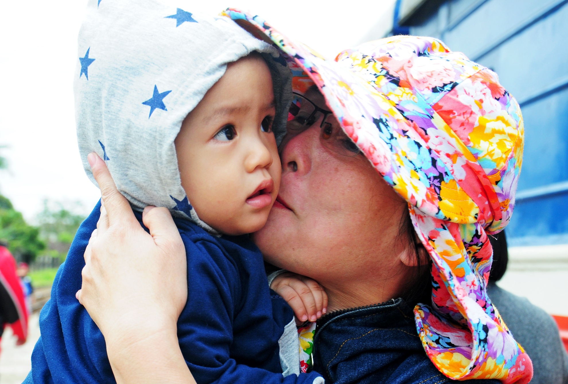 | Sau một năm xa cách, bà Lê Thị Kim Phước (ngụ xã Hành Thuận, huyện Nghĩa Hành) ôm cháu trai Huỳnh Hoàng Nguyên (1 tuổi) vừa theo cha mẹ từ TP HCM về Quảng Ngãi đón Tết cùng gia đình. |