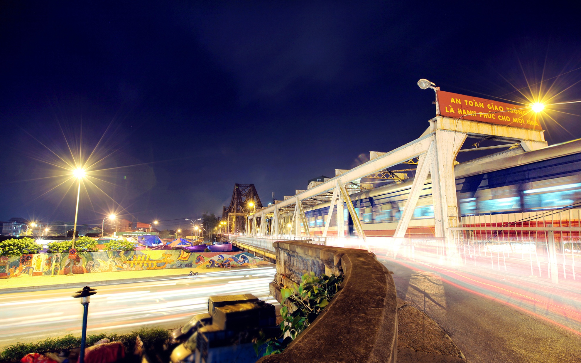Cầu Long Biên khi trời vừa tối. Đây là cây cầu thép đầu tiên bắc qua sông Hồng nối hai quận Hoàn Kiếm và Long Biên. Cầu thép bắc qua 3 thế kỷ này là một trong những biểu tượng của thủ đô và tuyến giao thông huyết mạch một thời. Ảnh: Tiến Đạt.