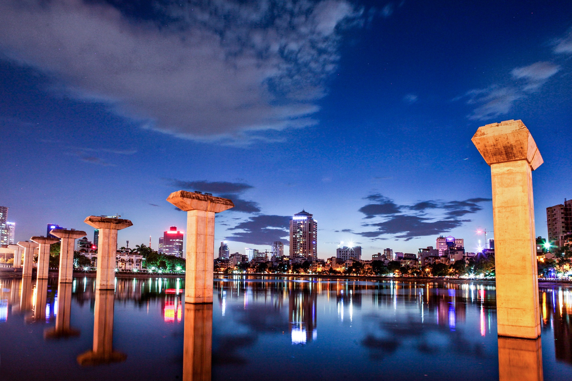 | Hồ Hoàng Cầu nằm giữa các phường Láng Hạ, Ô Chợ Dừa, quận Đống Đa (Hà Nội). Trên hồ là các cột trụ của dự án đường sắt trên cao tuyến số 2 Cát Linh - Hà Đông. |
