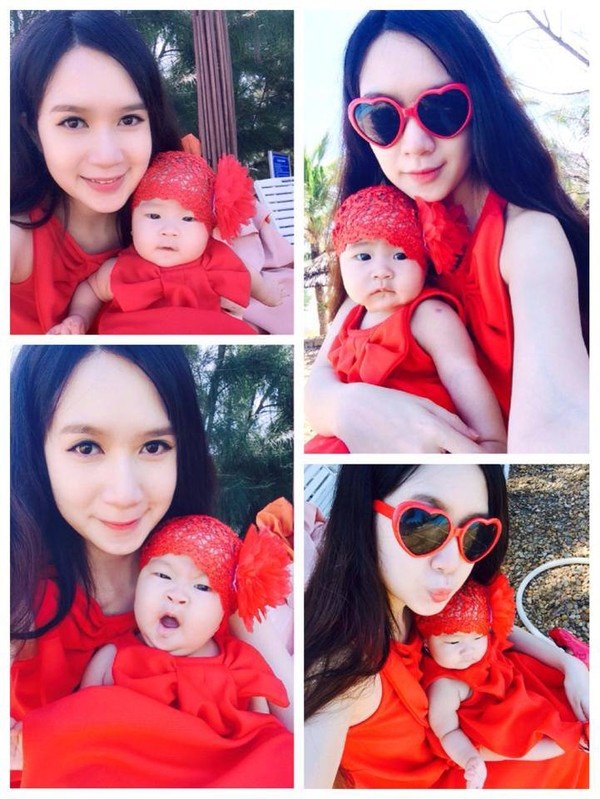 | Lê Phương cũng cho con diện trang phục cùng màu khi lần đầu ra mắt hình ảnh con trai. |