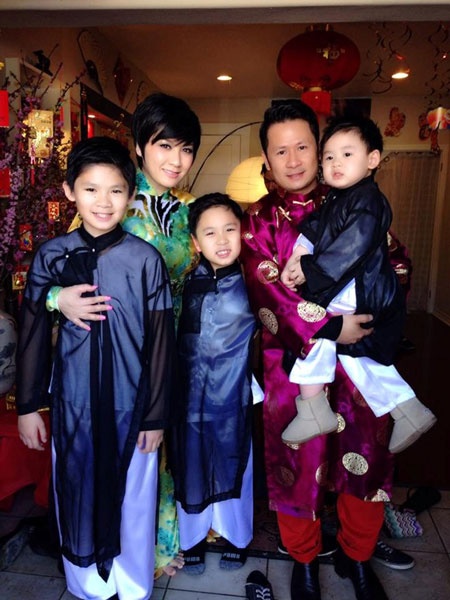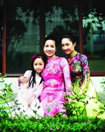 | Ba mẹ con nhà diva Mỹ Linh cùng diện trang phục áo dài đón Tết. |