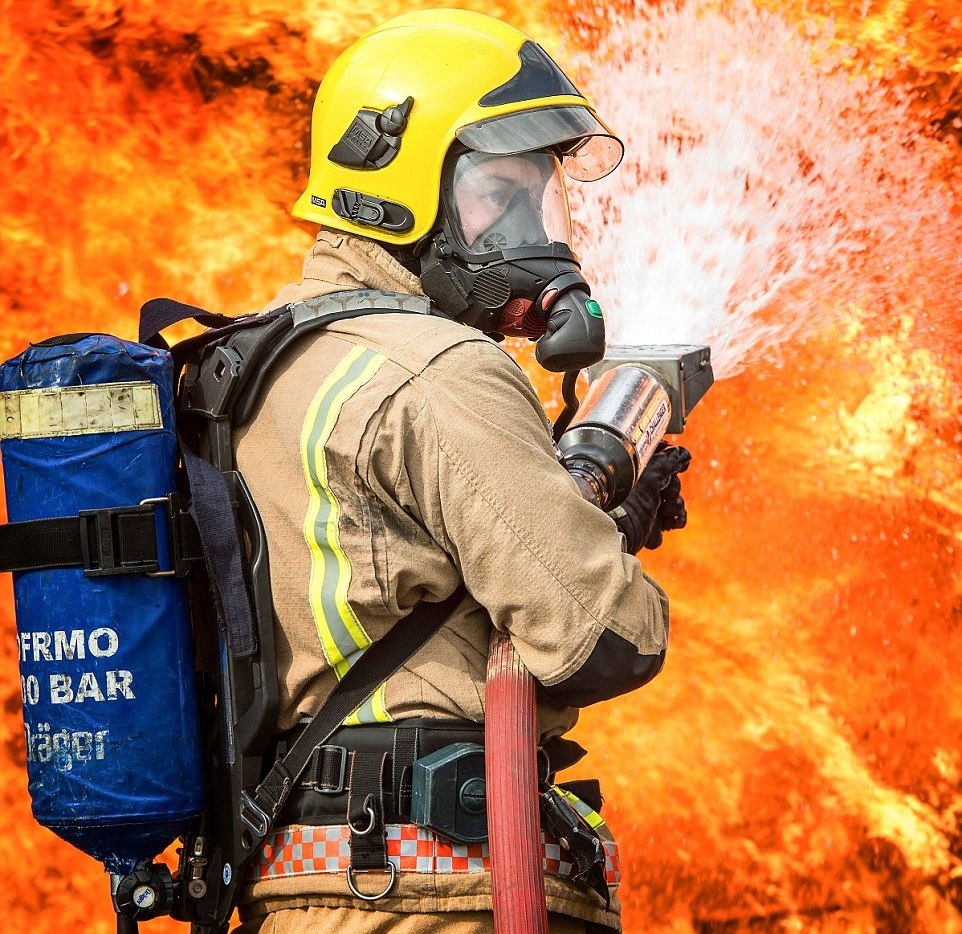 Nhân viên cứu hỏa dập tắt ngọn lửa mô phỏng trường hợp máy bay bốc cháy.