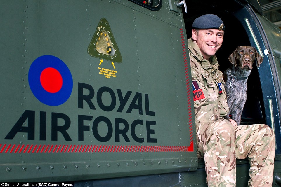 Trung sĩ Tanner, cựu chiến binh Afghanistan, ngồi cạnh chú chó nghiệp vụ Hertz trên trực thăng Puma ở căn cứ RAF Benson, hạt Oxfordshire. Đây là tác phẩm đoạt giải "Hình ảnh của năm" của nhiếp ảnh gia Connor Payne.