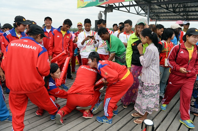 Các thành viên ban huấn luyện của các cô gái canoeing Myanmar cũng bộc lộ niềm vui.