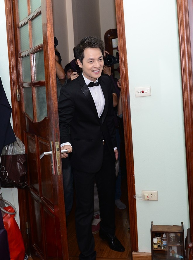 | Vừa có mặt tại ngõ của nhà vợ yêu, nam ca sĩ đã rạng rỡ dẫn đầu đoàn nhà trai tiến vào. |