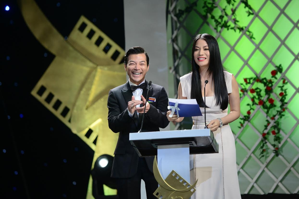 Chân dài Trương Ngọc Ánh tố chiều cao khiêm tốn của chồng cũ Trần Bảo Sơn khi cả hai tới dự lễ trao giải Cánh diều 2013 hồi tháng 3/2014.