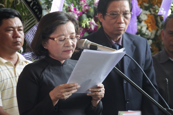 Đúng 13h30, lễ truy điệu nhà văn Nguyễn Quang Sáng diễn ra. Trong ảnh, bà Thân Thị Thư, Trưởng ban Tuyên giáo Thành ủy đọc điếu văn tiễn biệt.
