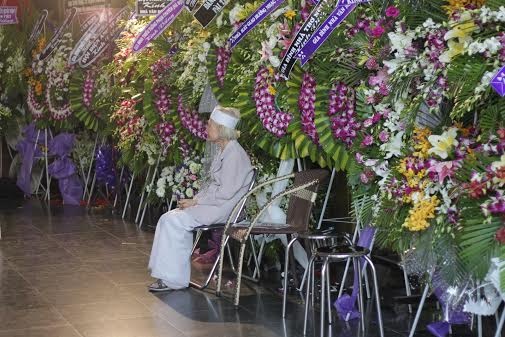 Khoảnh khắc bà Nguyễn Thị Lương - vợ nhà văn, ngồi lặng lẽ giữa những vòng hoa.