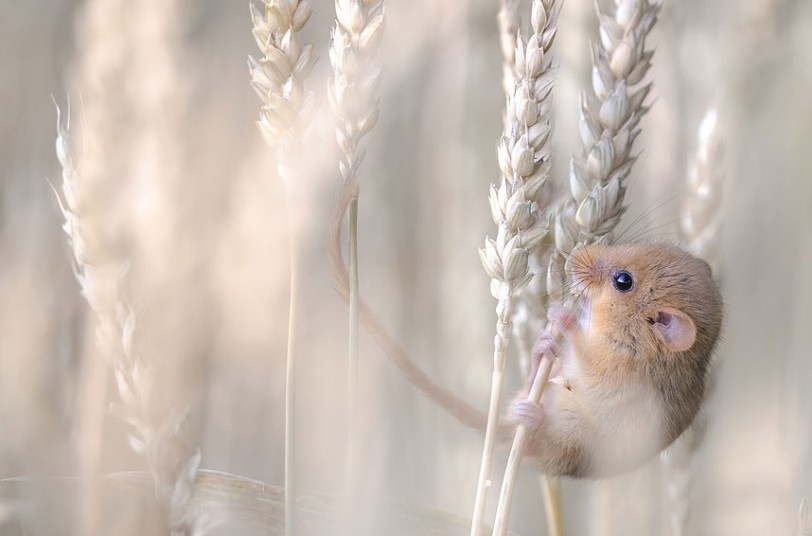 | Một chú chuột nhỏ bé bám vào thân cây bột mỳ ở làng Cousset, Thụy Sĩ. (Ảnh: Etienne Francey) |