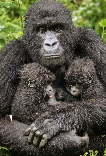 | Khỉ đột mẹ bế 2 con trong vườn quốc gia Núi lửa ở Rwanda. (Ảnh: Diana Webman) |