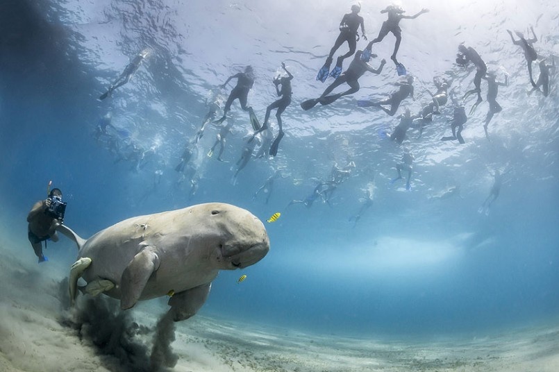 | Các thợ lặn vây quanh một con lợn biển ở vịnh Marsa Alam, Ai Cập. (Ảnh: Douglas Seifert) |