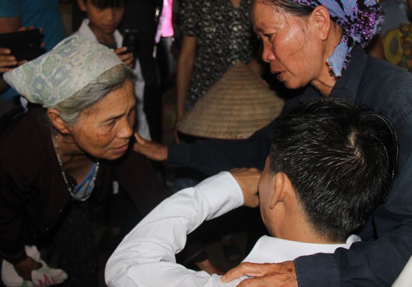 Ông Chấn (áo trắng) cảm động khi gặp lại người thân thiết sau chục năm xa cách. Lúc này, con ngõ nhỏ dẫn vào nhà ông Chấn cũng chật kín người.