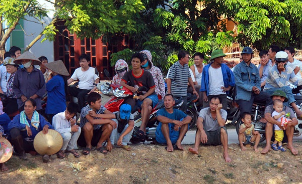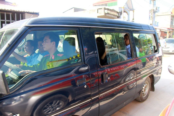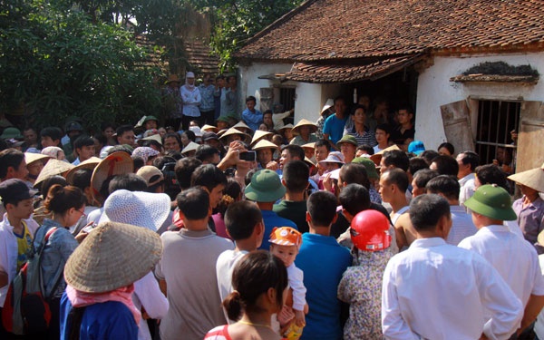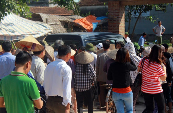 Gần 14h, xe chở Nguyễn Thanh Chấn có mặt ở quê nhà, nơi vợ con người đàn ông này đang sinh sống. Vài trăm người dân xuất hiện để theo dõi sự việc.