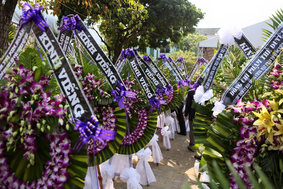 | Hàng trăm vòng hoa của các cơ quan, ban, ngành, tổ chức, cá nhân gửi đến viếng một vị lãnh đạo được nhiều người dân yêu mến. |