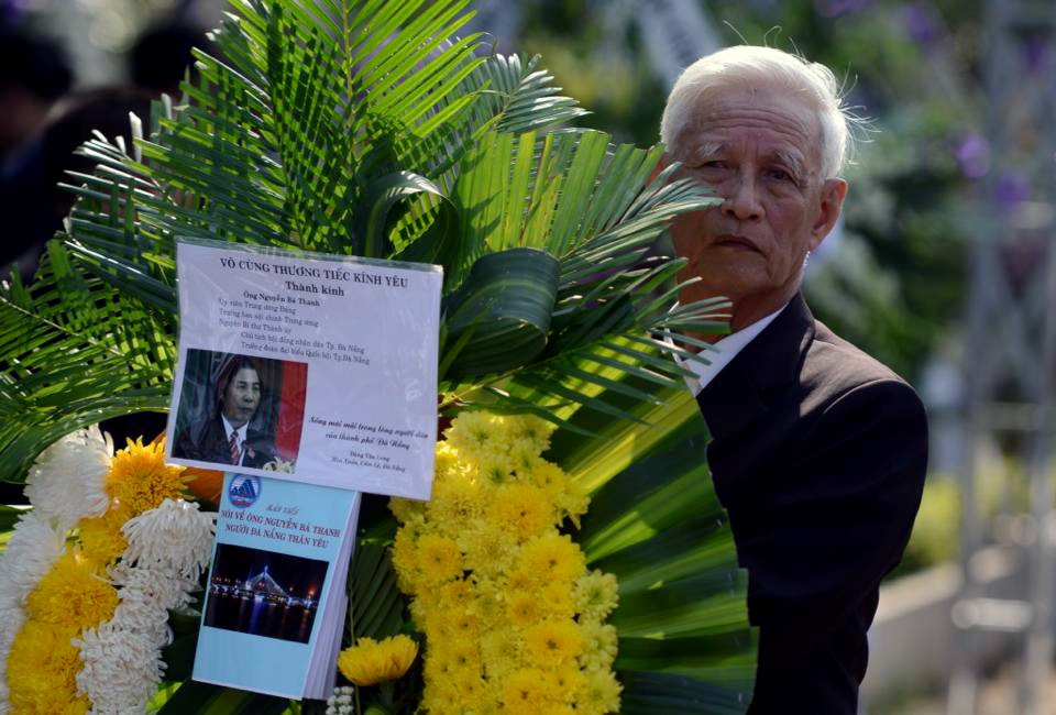 | Cụ Đặng Văn Long ở Hoà Xuân, Cẩm Lệ mang vòng hoa và gắn lên đó bài thơ, cuốn sách viết về Bá Thanh, nguyên Bí thư Đà Nẵng. |