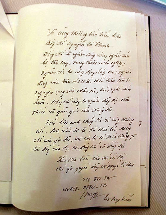 | Ông Tô Huy Rứa chia sẻ nỗi buồn trên cuốn sổ tang. |