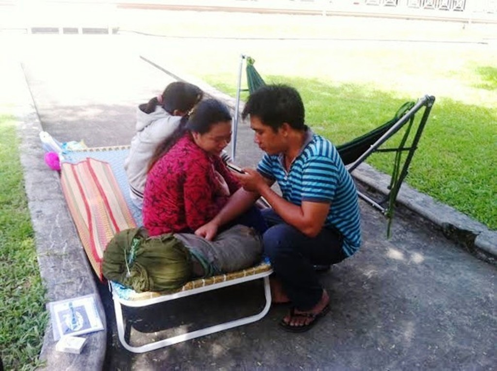 | Vợ chồng anh Phiên, chị Lam ngồi chờ bên hành lang phòng mổ. |