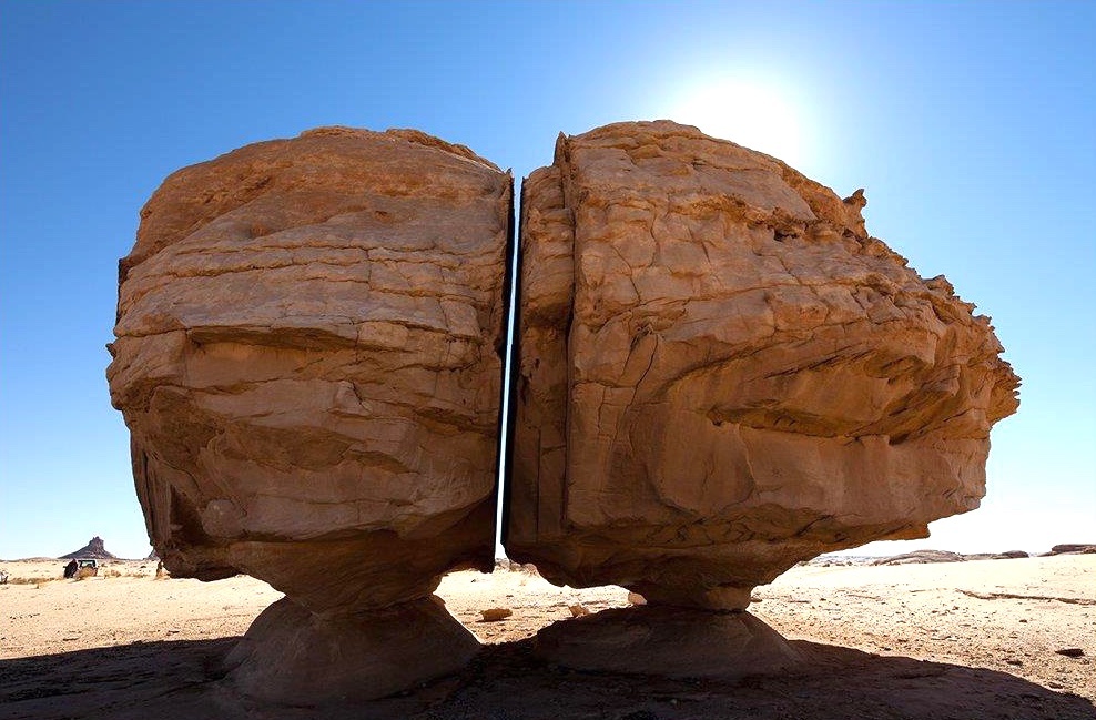 Tảng đá Al Naslaa nằm ở ốc đảo sa mạc Tayma, Arab Saudi, Tây Á. Khối đá nặng hàng trăm tấn đứng cân bằng trên một phiến đá mỏng. Năm 1883, Charles Huver phát hiện tảng đá này bị tách thành 2 nửa bằng nhau bởi vết nứt thẳng và nhẵn đến khó tin, mỗi phần cao khoảng 7 m. Nguồn gốc vết cắt đến nay vẫn chưa có lời giải thích thỏa đáng. Ảnh: Destinationksa. |