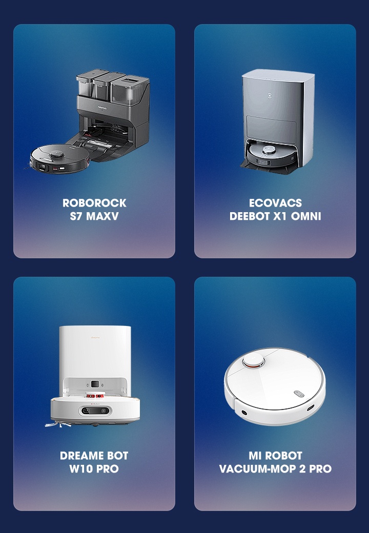 4 lựa chọn Zing đề cử gồm Ecovacs Deebot X1 OMNI, Roborock S7 MaxV, Dreame Bot W10 Pro, Mi Robot Vacuum-Mop 2 Pro. Các sản phẩm nêu trên đều là dòng robot hút bụi cao cấp, với công suất động cơ lớn, hỗ trợ làm sạch diện tích rộng, lau nhà tự động, nhận diện vật thể.