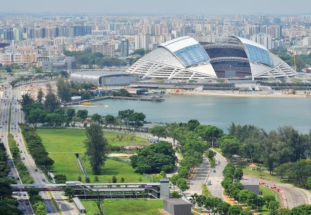 | Bầu trời quang đãng xung quanh khu liên hợp thể thao Sports Hub hồi tháng 5/2014 (trái) và cảnh khói mù bao trùm khu vực này lúc 9h30 hôm 5/10. Chỉ số ô nhiễm không khí (PSI) đo được tại đây trong 3 tiếng là 142 – vượt quá mức 100. Ảnh: Straits Times. |