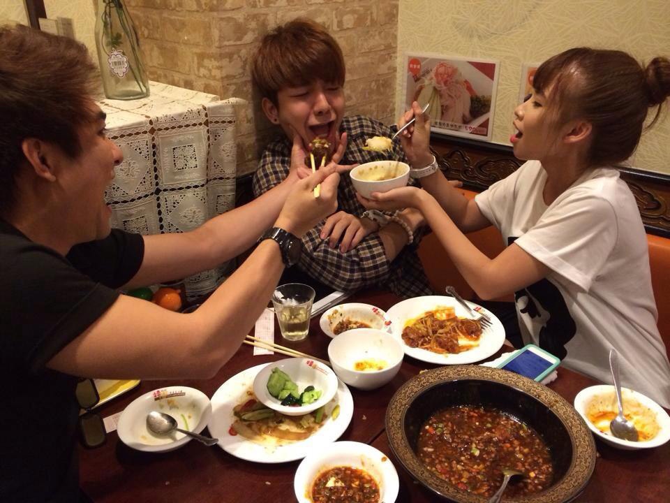 | Khởi My và bạn bè trêu chọc bạn trai tin đồn trong bữa ăn. |