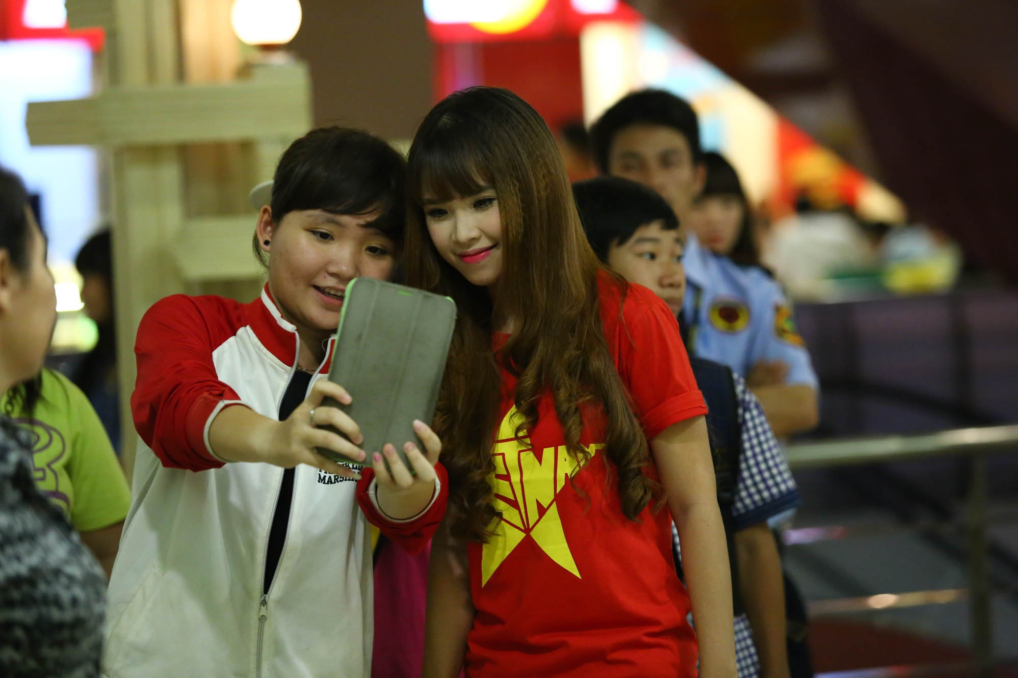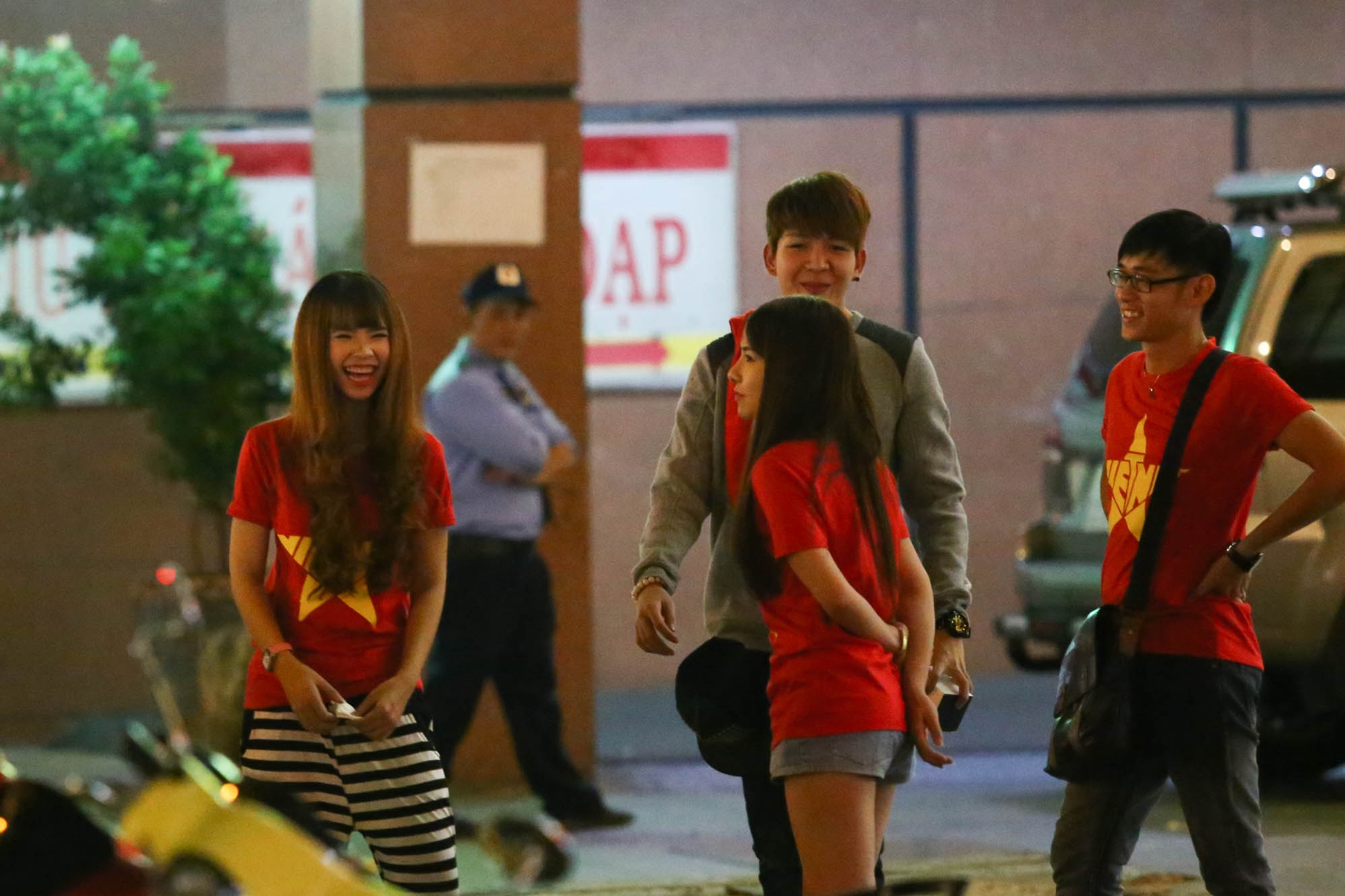 | Khởi My khá hòa đồng, thân thiện với bạn bè cũng như người hâm mộ. Nhóm bạn trò chuyện rôm rả trước khi lên xe rời đi. |