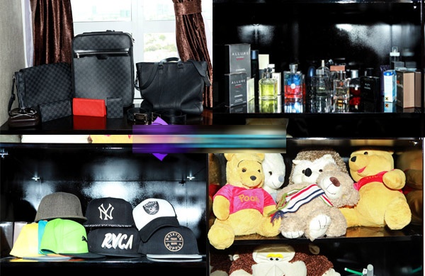 | Bộ sưu tập nước hoa, túi xách vali hiệu LV, mũ lưỡi trai, gấu bông được fan tặng của chàng ca sĩ. |